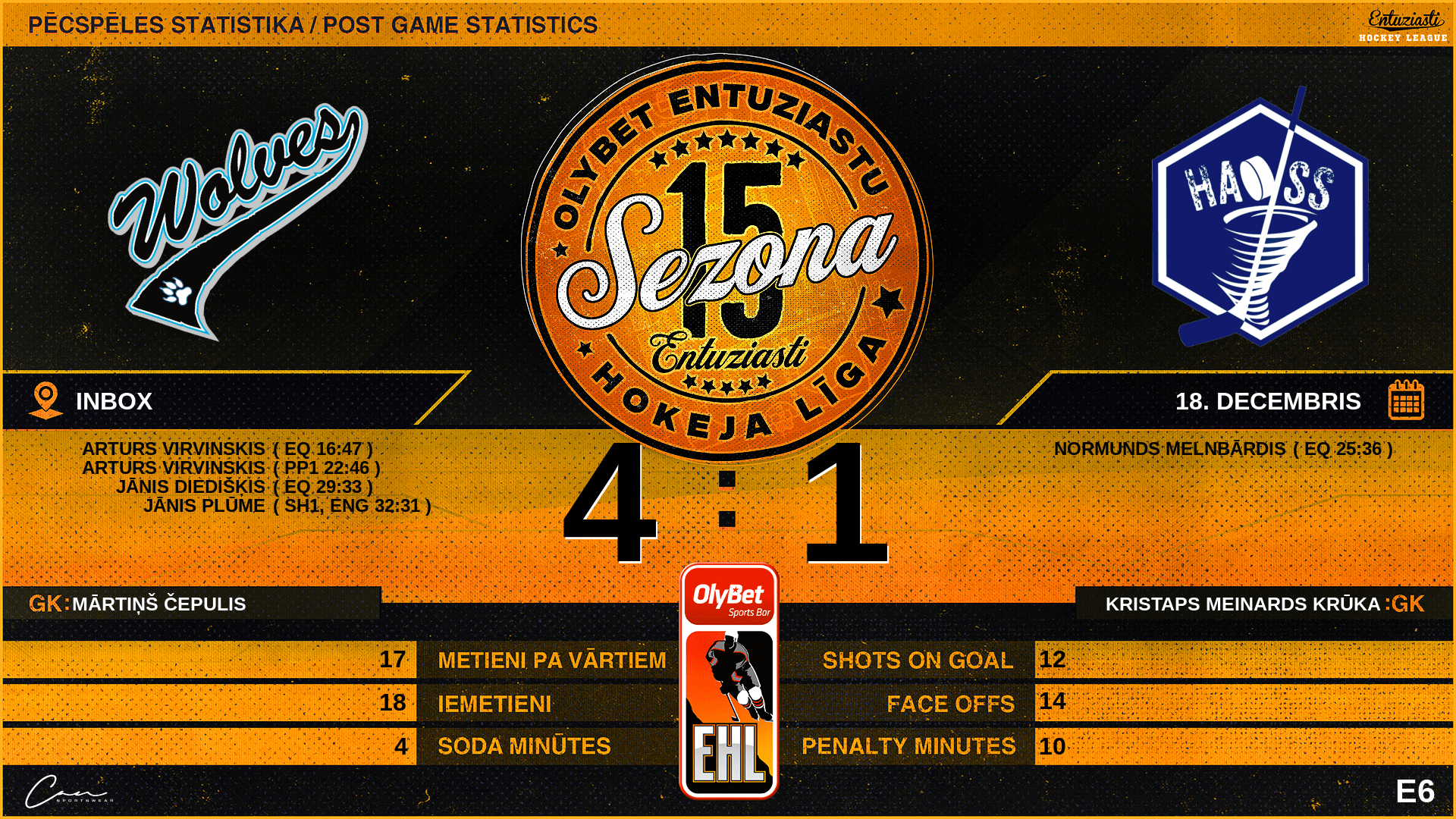 | 22:46 | WF3 | Vārti (PP1) | #16 Arturs Virvinskis, piespēles: #88 Ģirts Bebrovskis, #37 Sergejs Volvenkins |