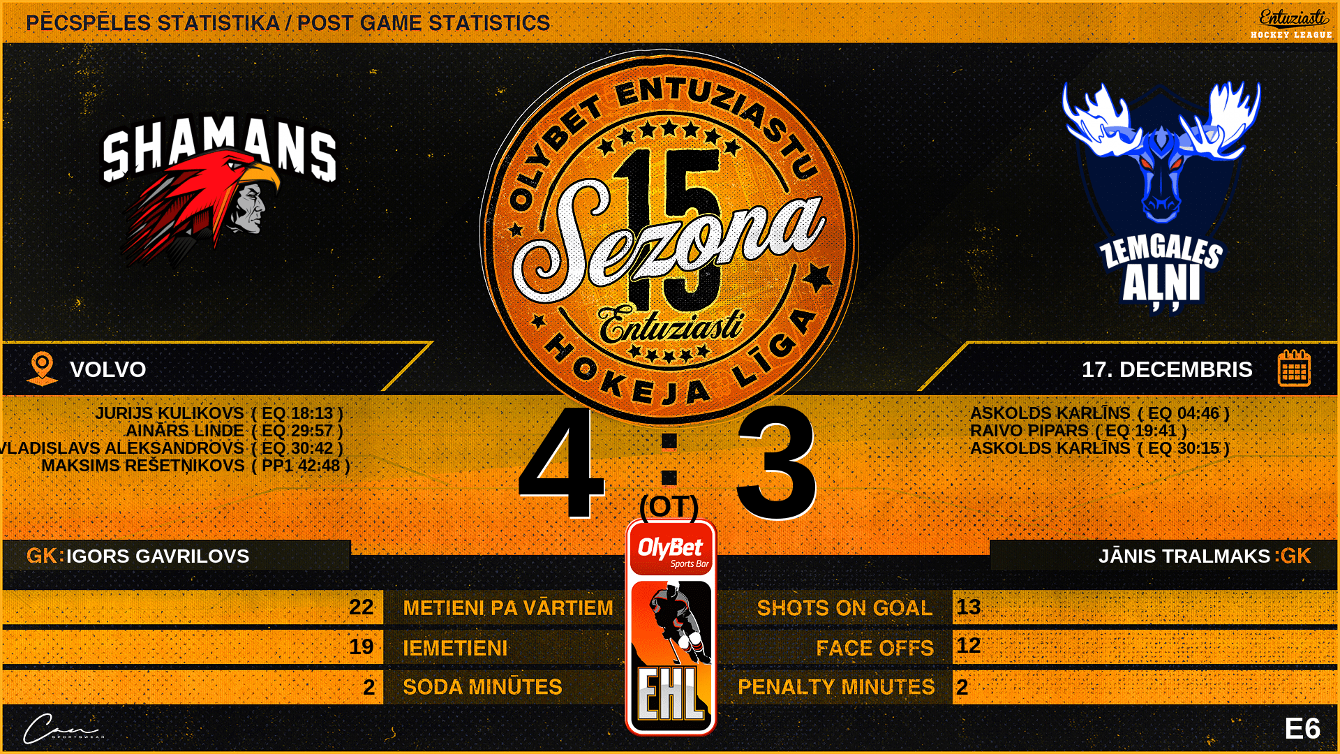 | 18:13 | SHM | Vārti (EQ) | #24 Jurijs Kulikovs |