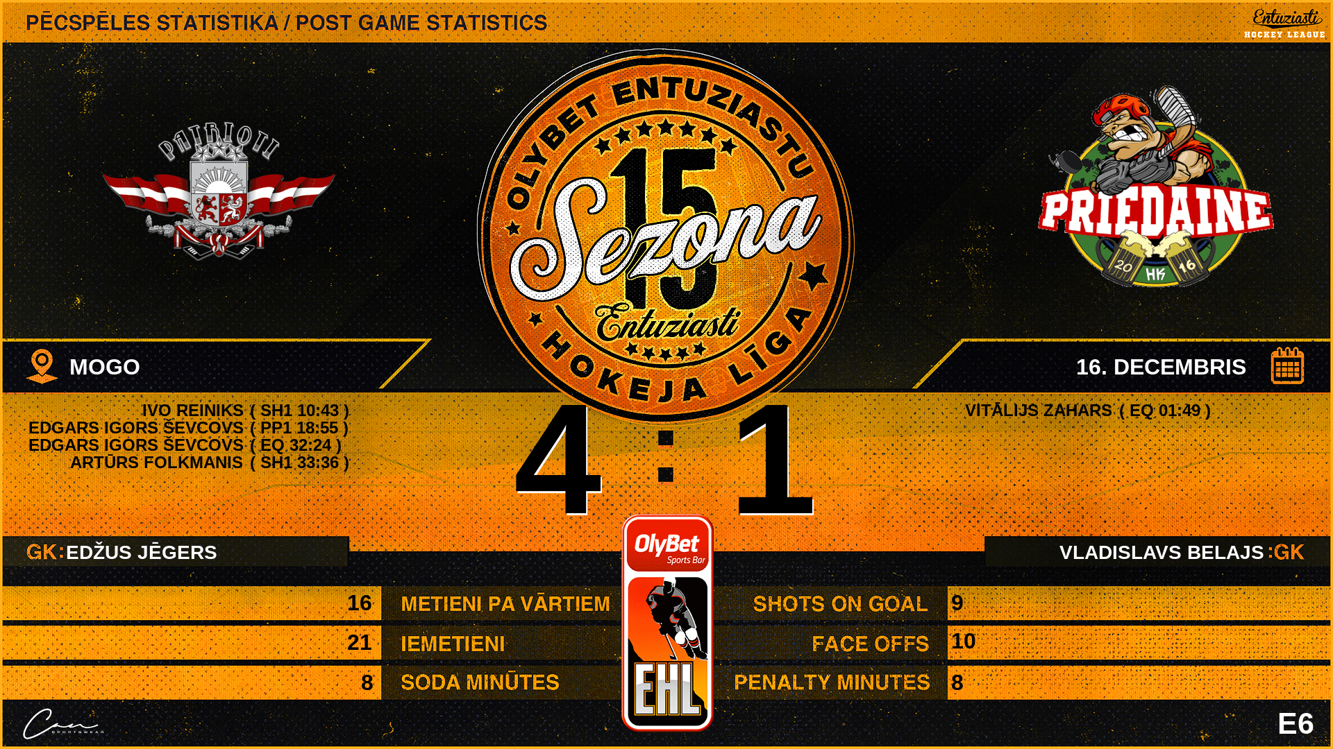 | 10:43 | PTR | Vārti (SH1) | #86 Ivo Reiniks, piespēles: #84 Gatis Miglāns, #96 Ansis Lasmanis |