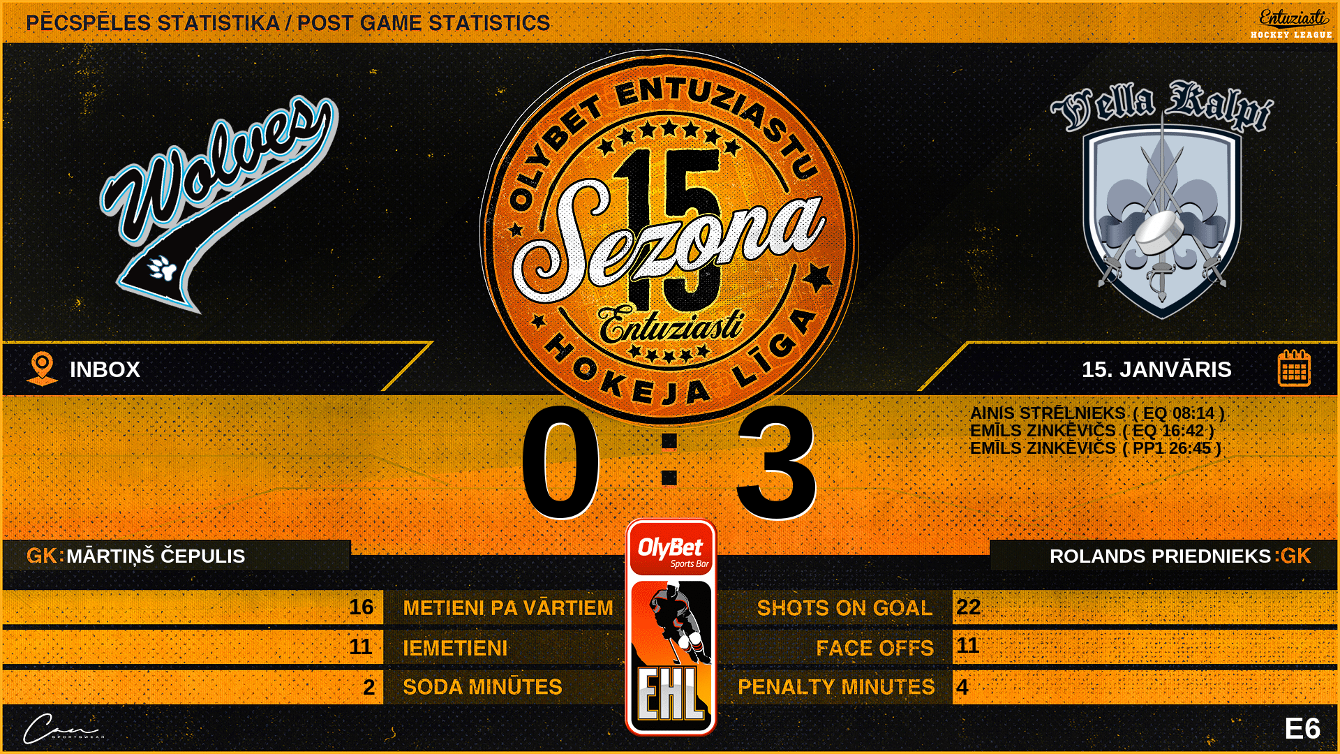 | 26:45 | VKA | Vārti (PP1) | #99 Emīls Zinkēvičs, piespēles: #82 Kaspars Burkits, #89 Raivo Midziņš |