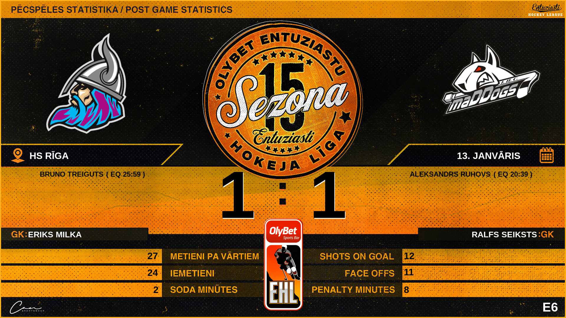 | 25:59 | LDV | Vārti (EQ) | #13 Bruno Treiguts, piespēles: #7 Aigars Ābols |