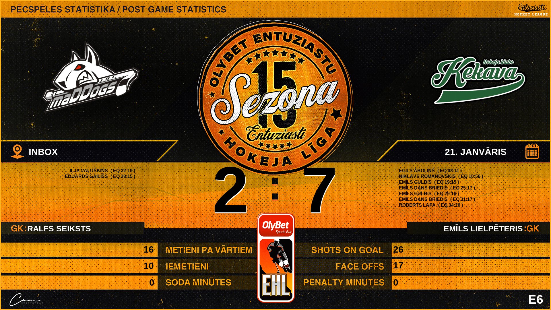 | 08:11 | ĶE2 | Vārti (EQ) | #3 Egils Āboliņš, piespēles: #68 Krists Miksons, #10 Niklāvs Romanovskis |