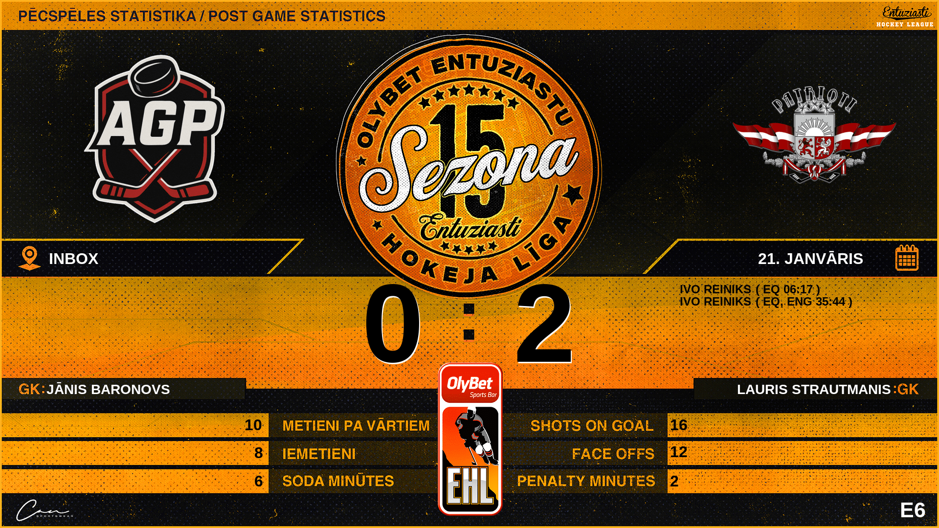 | 35:44 | AGP | GK In | #31 Jānis Baronovs |