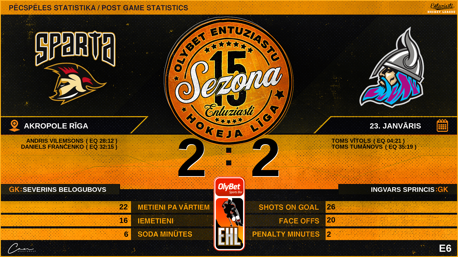 | 04:21 | LDV | Vārti (EQ) SP2 0 : 1 LDV | #9 Toms Vītols, piespēles: #55 Ritvars Šteins, #96 Toms Tumānovs |