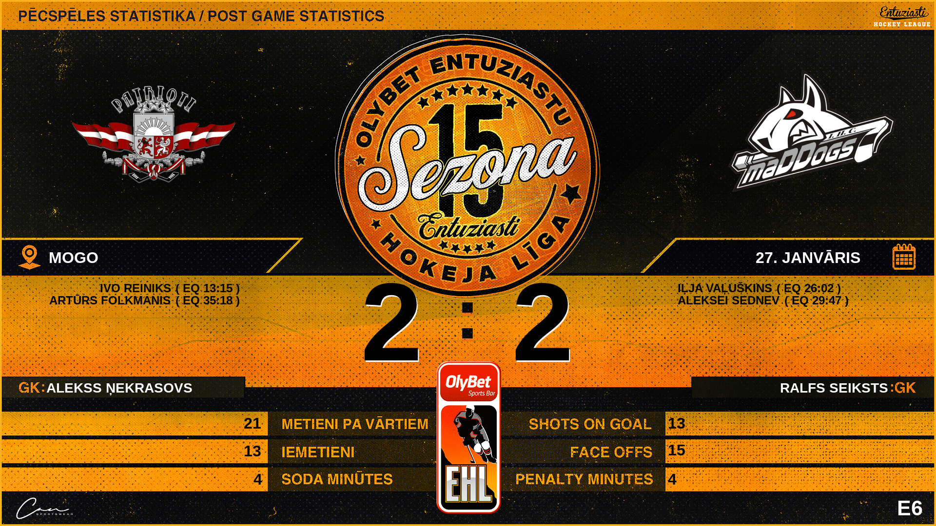 | 43:09 | MDG | Noraidījums | #33 Andrejs Shakurs - Roughing (2 min) |