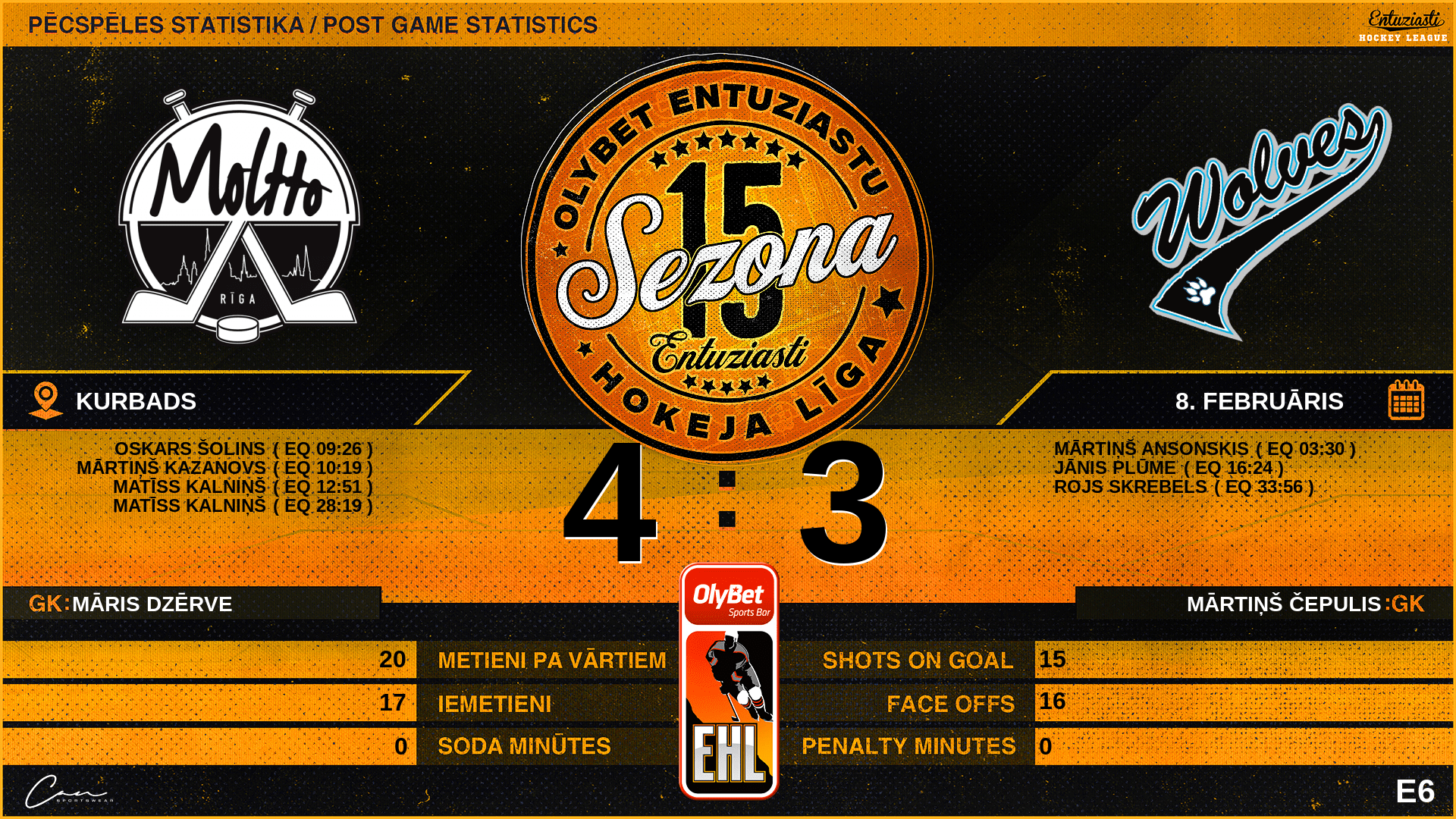 | 33:56 | WF3 | Vārti (EQ) MTO 4 : 3 WF3 | #97 Rojs Skrebels, piespēles: #84 Aleksejs Carjovs, #16 Arturs Virvinskis |