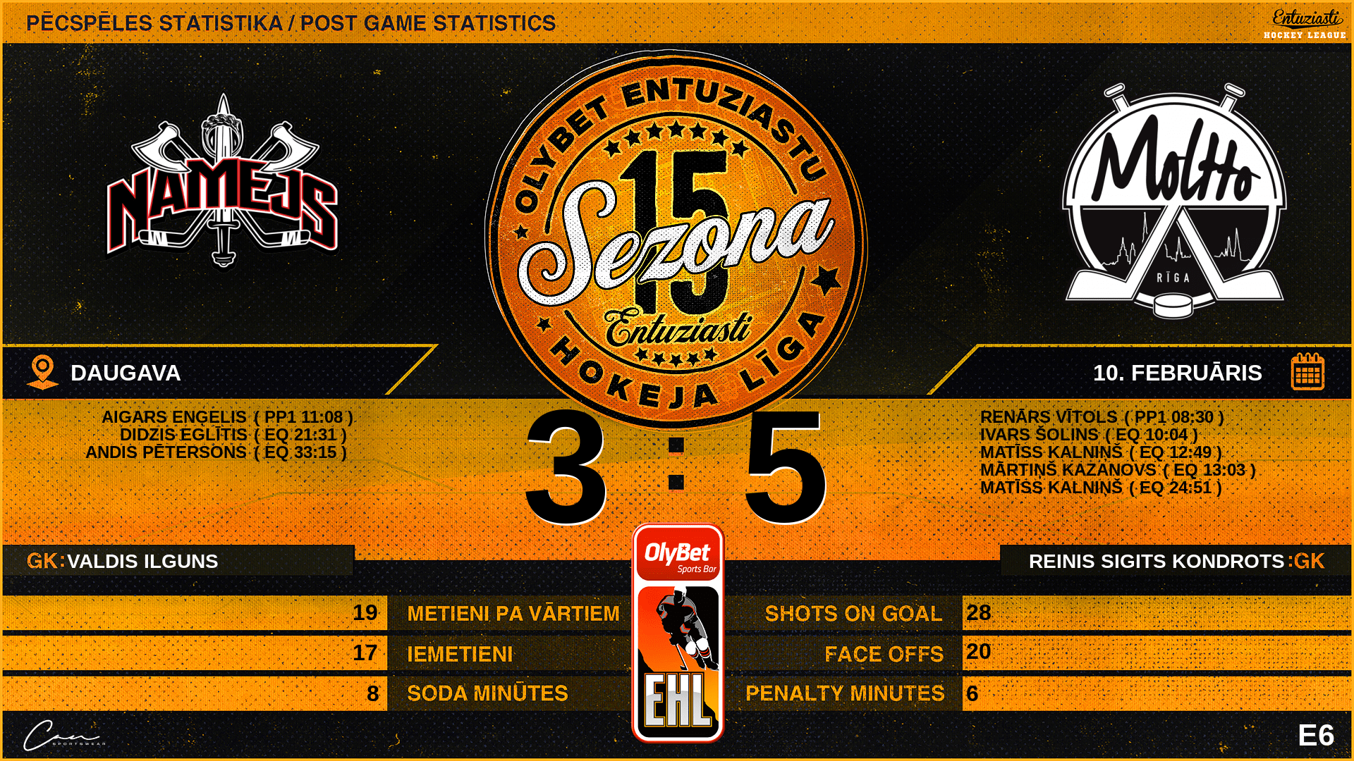 | 13:03 | MTO | Vārti (EQ) | #60 Mārtiņš Kazanovs, piespēles: #77 Raitis Mazūdris, #12 Renārs Vītols |
