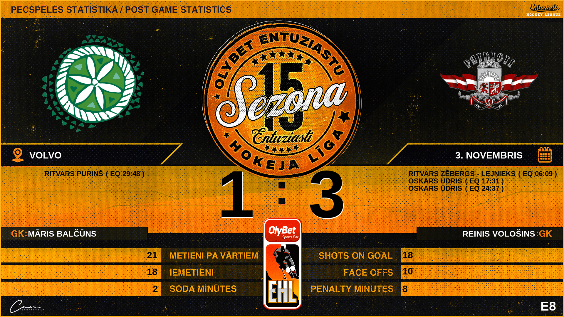 | 24:37 | PT2 | Vārti (EQ) | #34 Oskars Ūdris, piespēles: #11 Ritvars Ohnovskis, #7 Ivars Seikovskis |