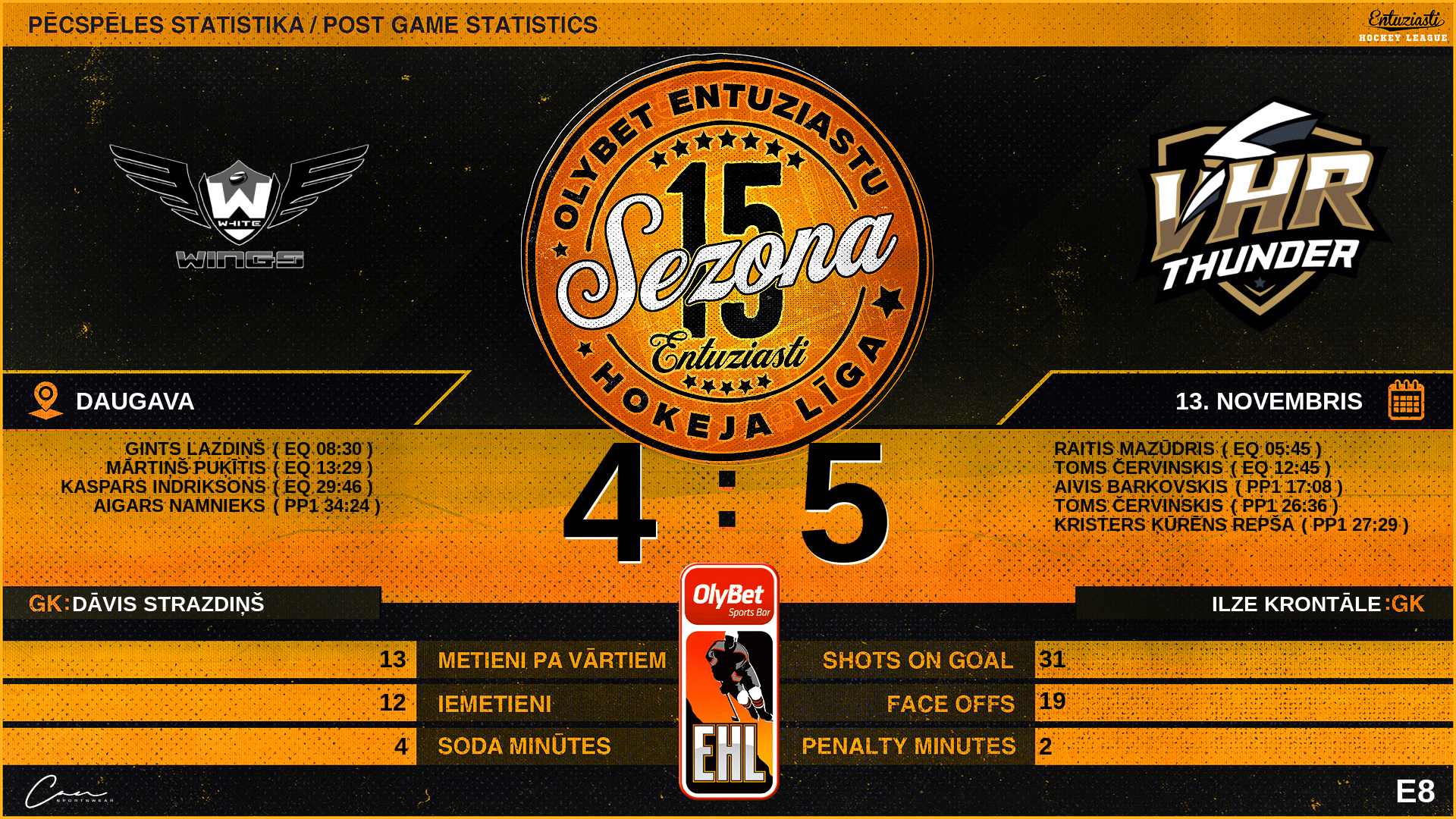 | 08:30 | WTW | Vārti (EQ) | #76 Gints Lazdiņš, piespēles: #4 Ingus Strods, #13 Jānis Pekstiņš |