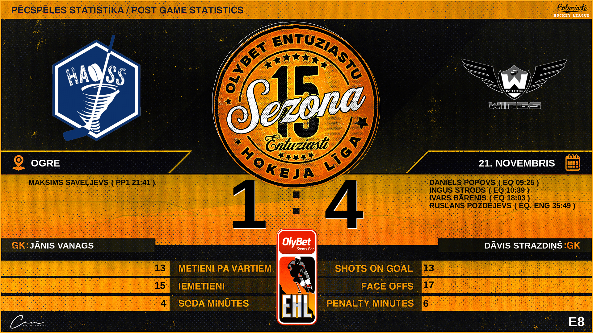 | 18:03 | WTW | Vārti (EQ) | #39 Ivars Bārenis, piespēles: #76 Gints Lazdiņš, #15 Gatis Vorkalis |