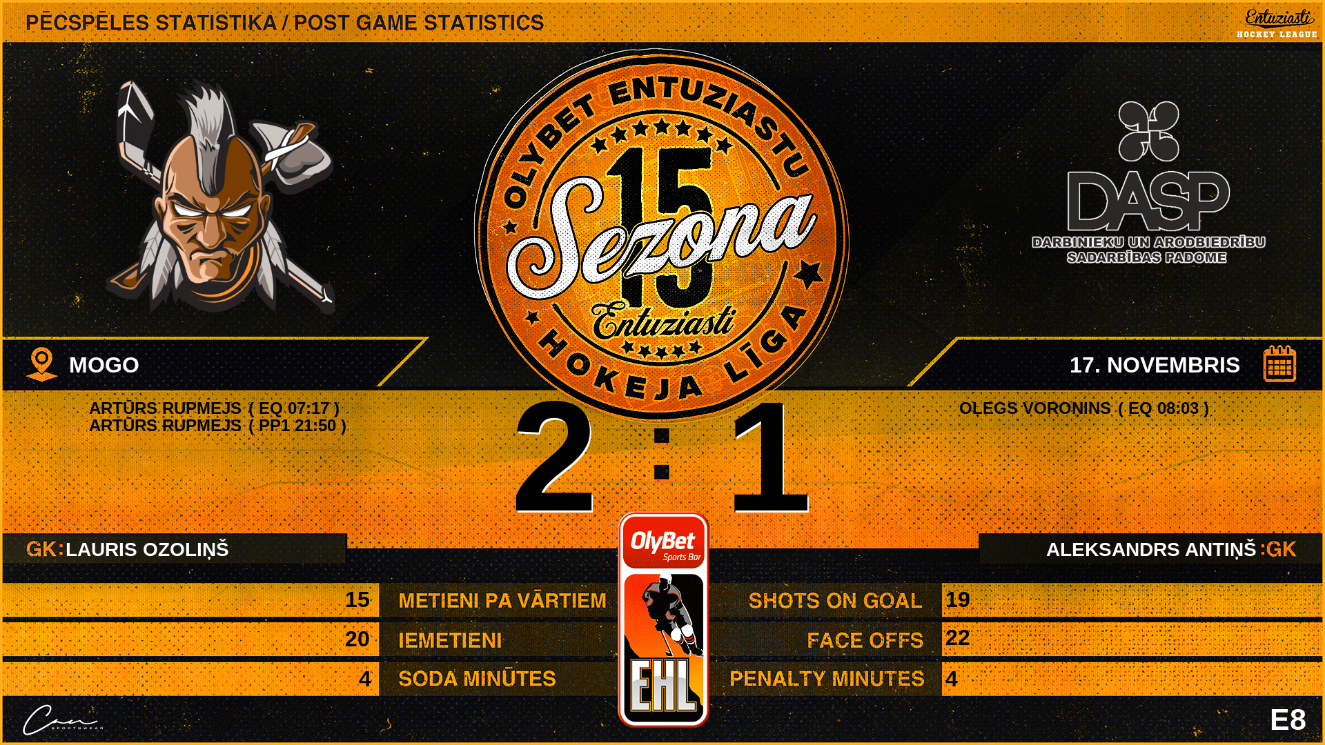 | 07:17 | MZ2 | Vārti (EQ) | #28 Artūrs Rupmejs, piespēles: #5 Toms Bergmanis, #11 Matīss Matigars Ezeriņš |