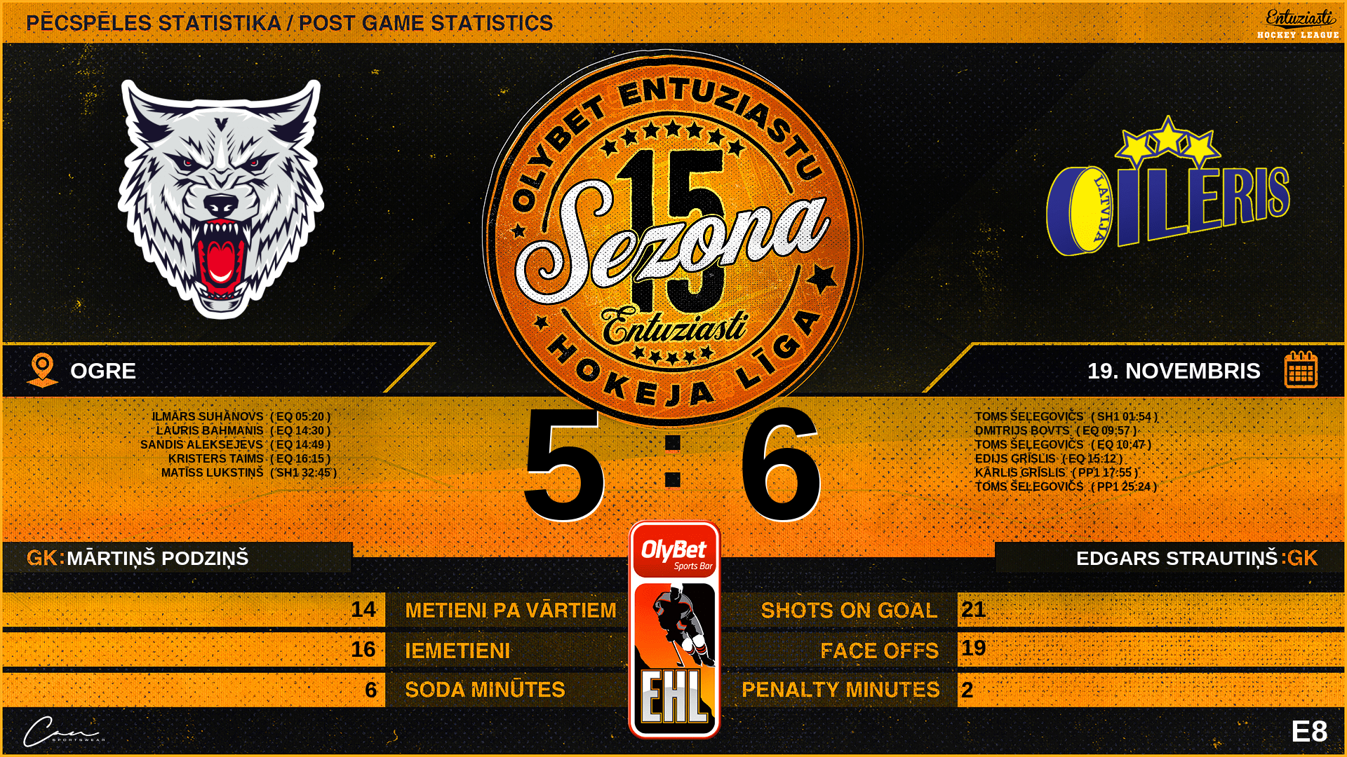 | 17:55 | OLR | Vārti (PP1) | #21 Kārlis Grīslis, piespēles: #5 Kārlis Karlsons |