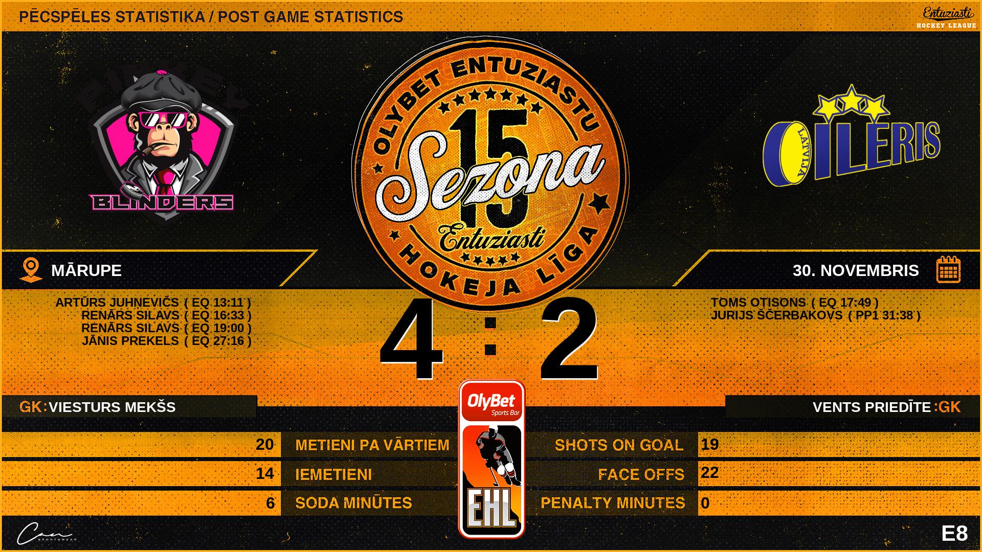 | 19:00 | PNB | Vārti (EQ) | #13 Renārs Silavs, piespēles: #27 Jānis Prekels |