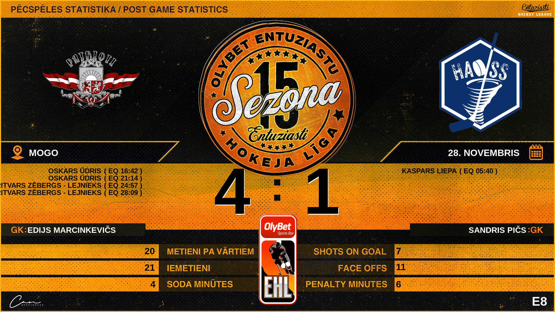 | 21:14 | PT2 | Vārti (EQ) | #34 Oskars Ūdris, piespēles: #6 Gustavs Švinka |
