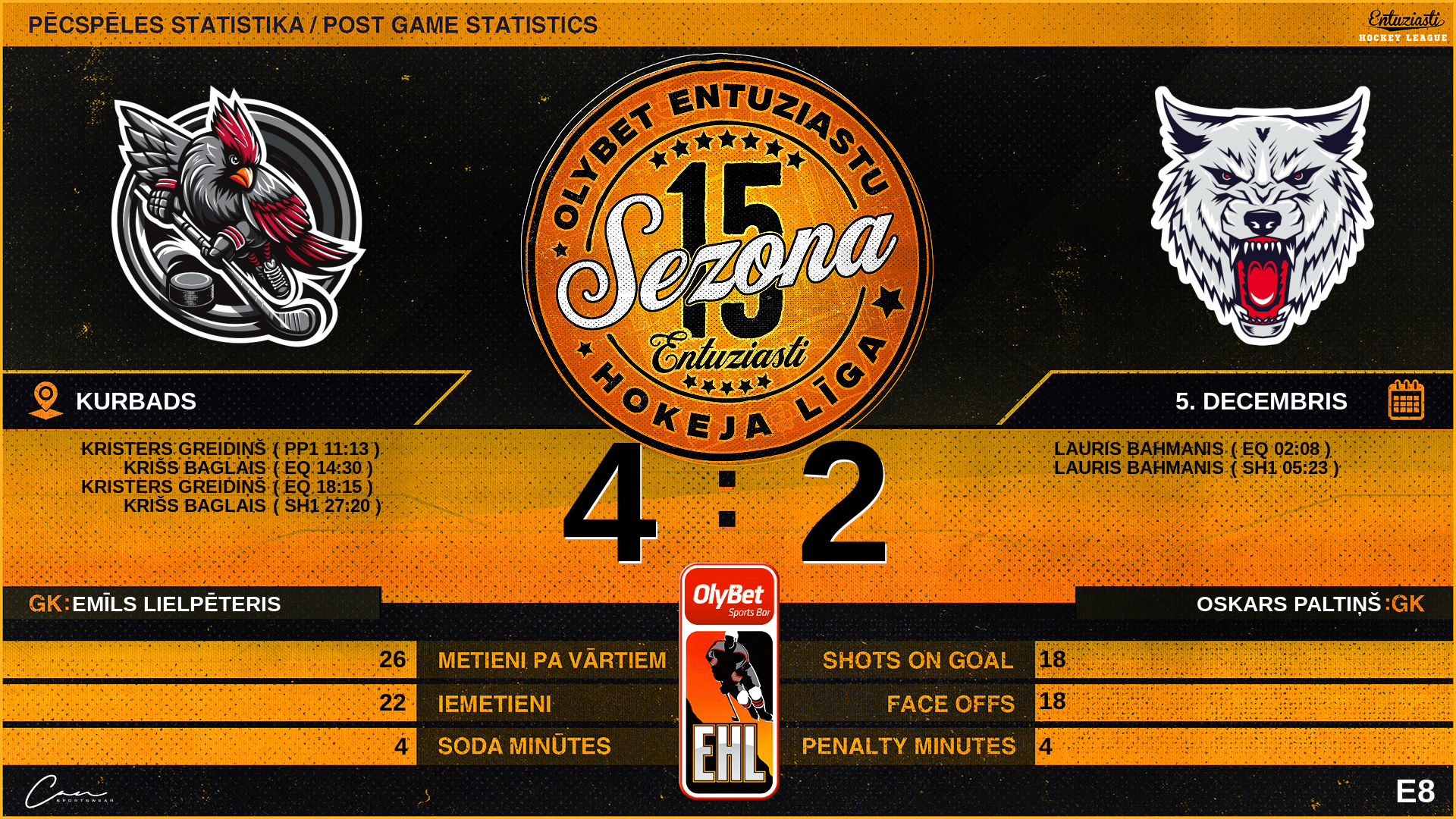 | 14:30 | PLK | Vārti (EQ) | #31 Krišs Baglais, piespēles: #69 Dāvis Zukurs |
