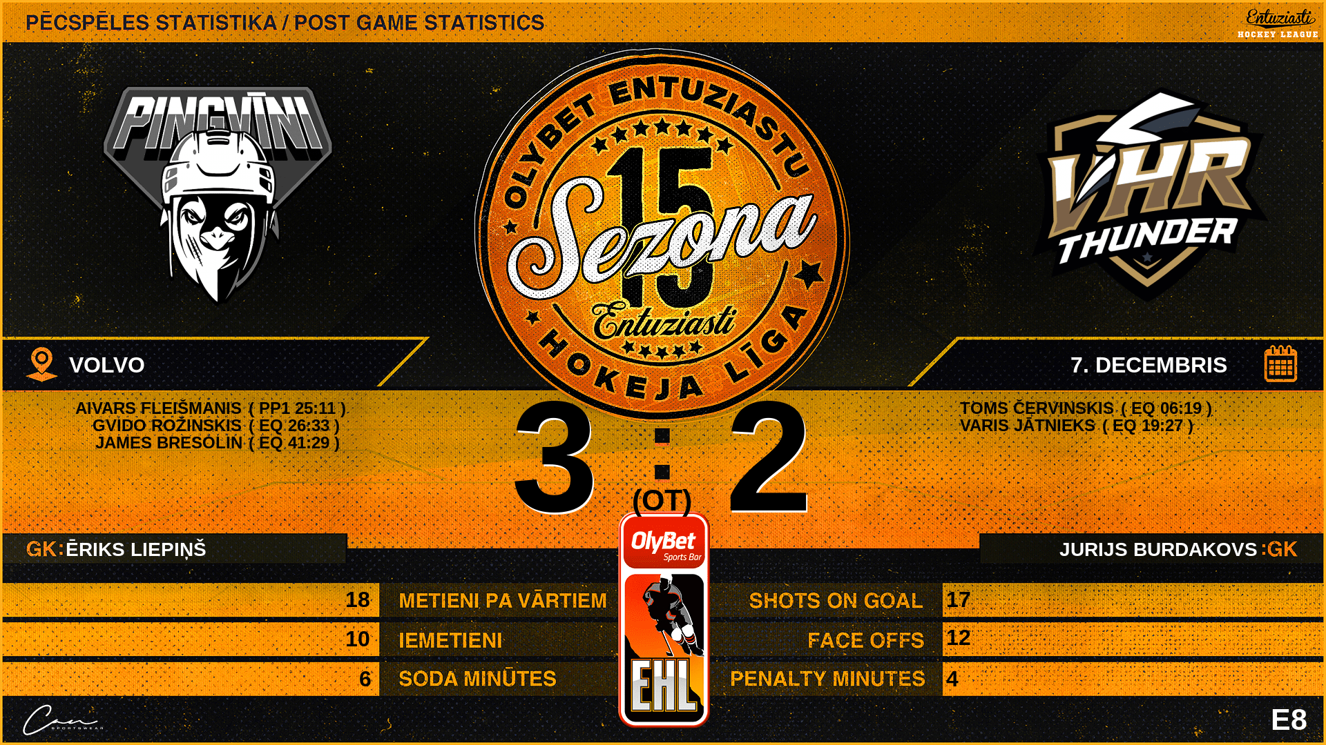 | 06:19 | VHR | Vārti (EQ) | #11 Toms Červinskis, piespēles: #46 Kristers Ķūrēns Repša |