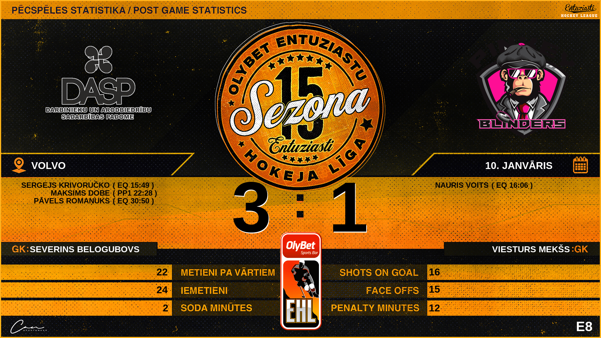 | 15:49 | DAS | Vārti (EQ) | #11 Sergejs Krivoručko, piespēles: #17 Pāvels Romaņuks |