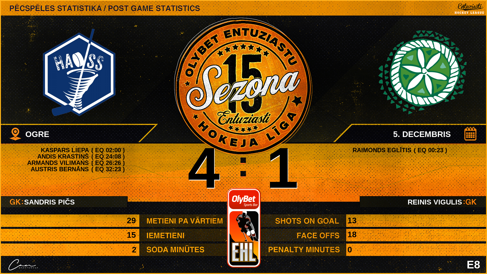 | 26:26 | HA2 | Vārti (EQ) | #58 Armands Vilimans, piespēles: #76 Kristaps Grigorjevičs |