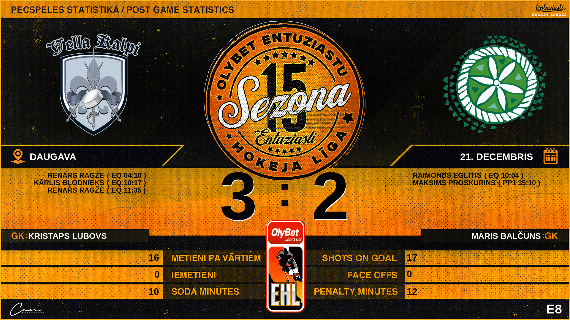 | 04:10 | VKL | Vārti (EQ) | #27 Renārs Ragže, piespēles: #79 Jānis Ansons, #9 Edgars Polis |