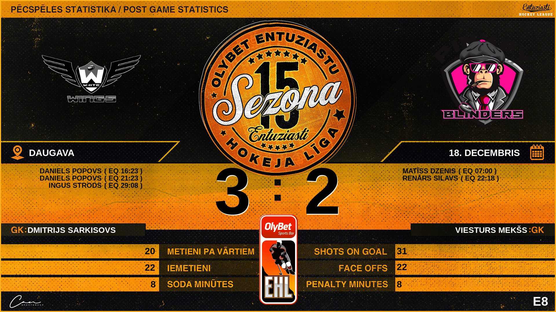 | 16:23 | WTW | Vārti (EQ) | #88 Daniels Popovs, piespēles: #21 Aigars Namnieks, #4 Ingus Strods |
