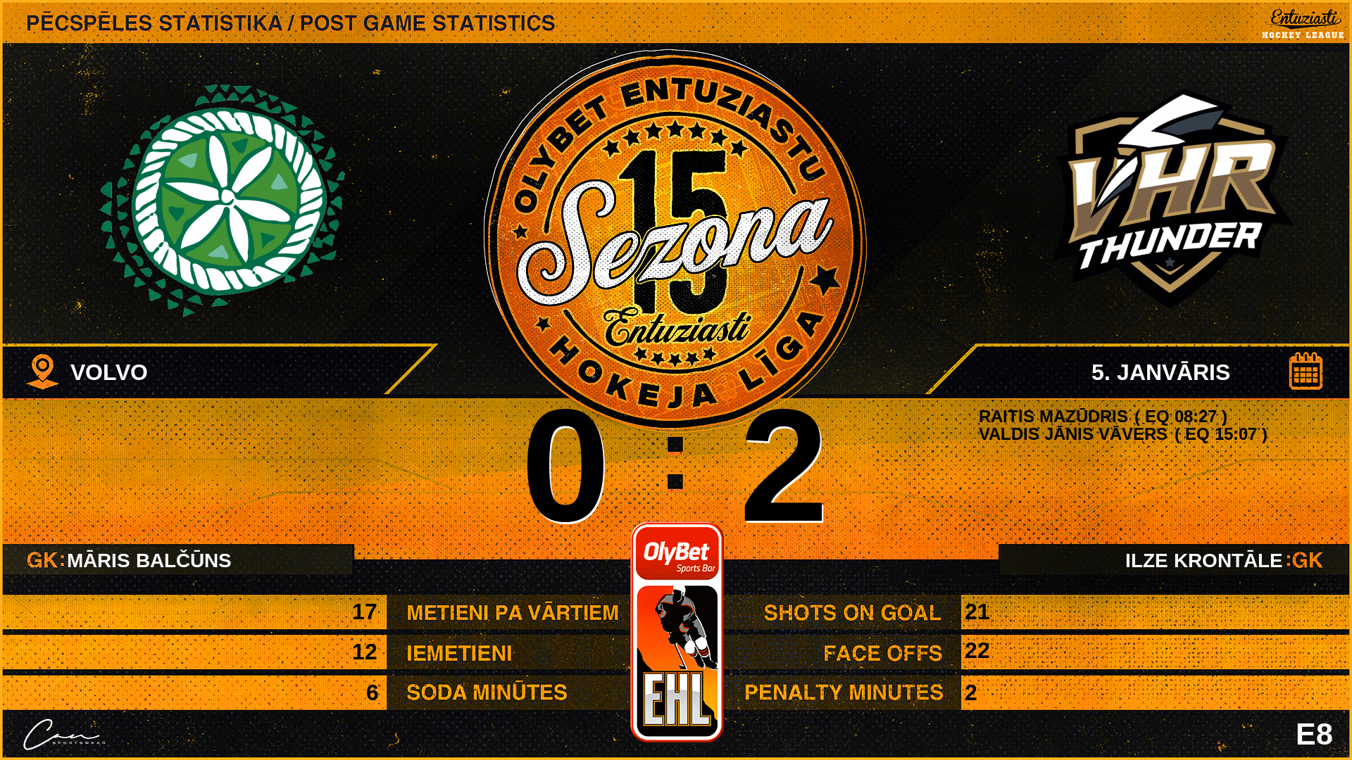 | 08:27 | VHR | Vārti (EQ) | #77 Raitis Mazūdris, piespēles: #97 Kristers Stelmaks, #99 Artūrs Harijs Jansons |
