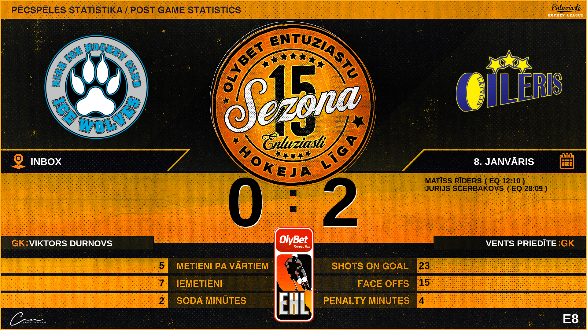 | 28:09 | OLR | Vārti (EQ) | #17 Jurijs Ščerbakovs, piespēles: #35 Toms Šeļegovičs |