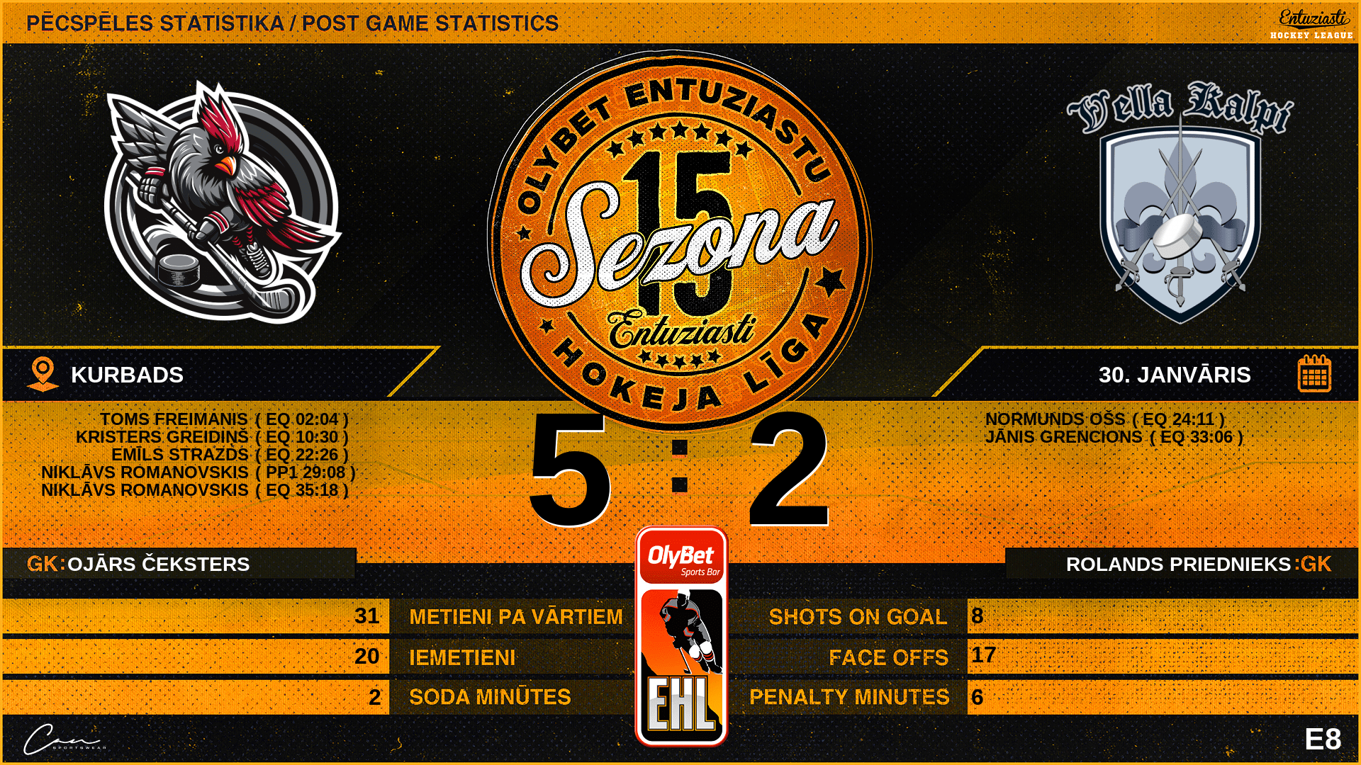 | 33:06 | VKL | Vārti (EQ) | #21 Jānis Grencions, piespēles: #82 Kaspars Burkits |