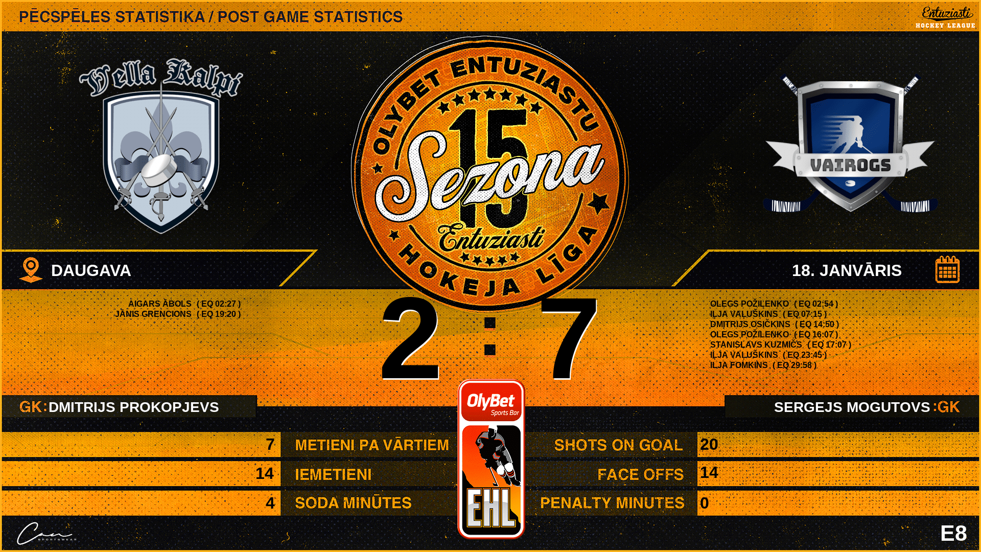 | 19:20 | VKL | Vārti (EQ) | #21 Jānis Grencions, piespēles: #28 Edijs Krišāns, #44 Mārtiņš Īle |