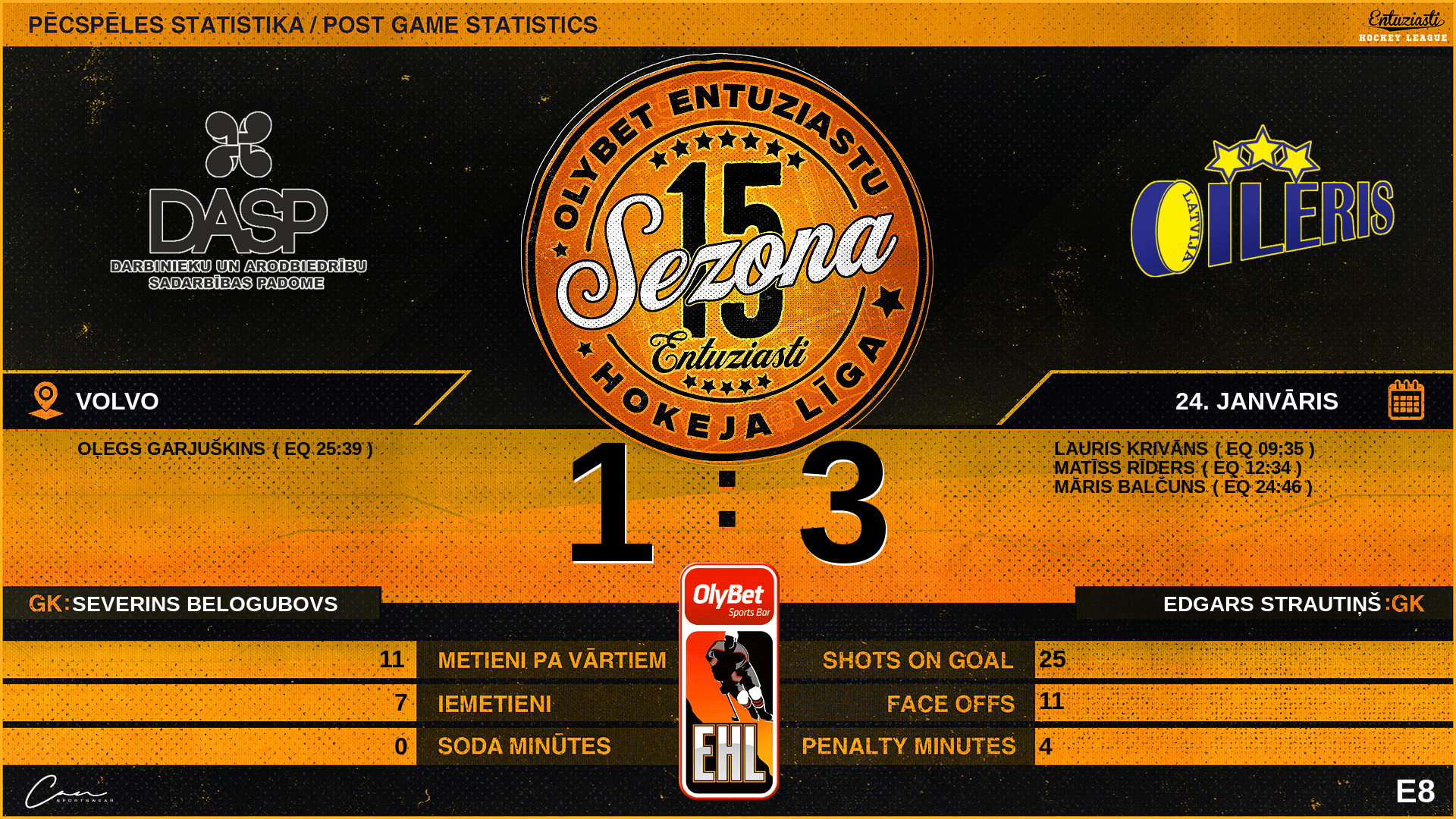 | 25:39 | DAS | Vārti (EQ) | #22 Oļegs Garjuškins, piespēles: #44 Pāvels Assanovs |