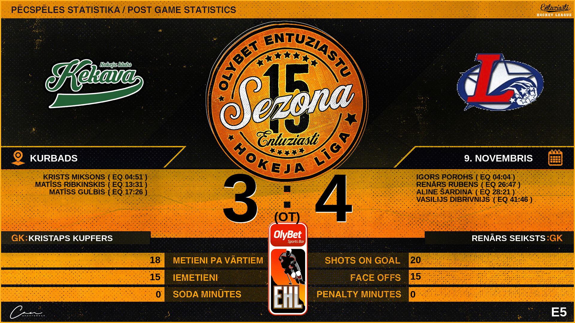 | 17:26 | ĶK1 | Vārti (EQ) | #28 Matīss Gulbis, piespēles: #99 Kristaps Bžežinskis |
