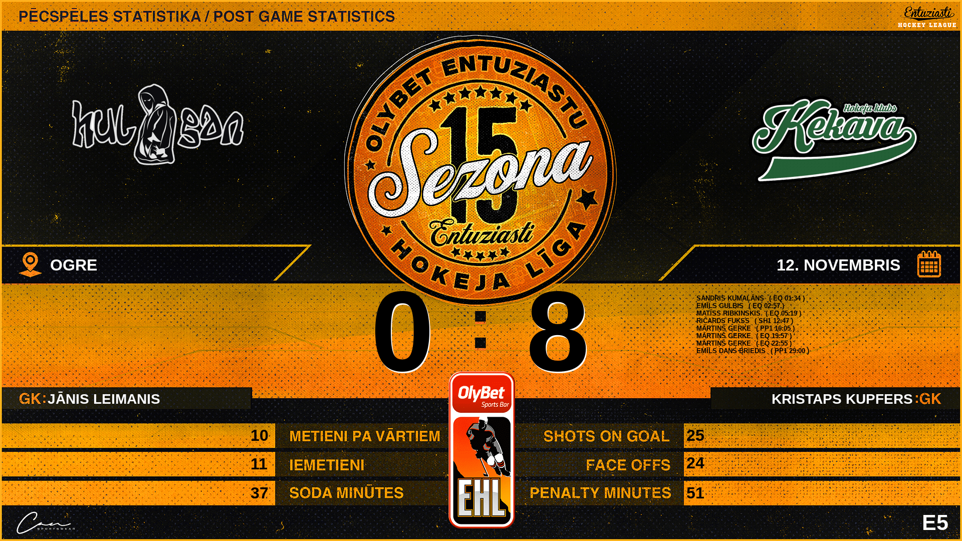 | 22:55 | ĶK1 | Vārti (EQ) | #18 Mārtiņš Gerke, piespēles: #69 Ričards Fukss, #5 Sandris Kumalāns |