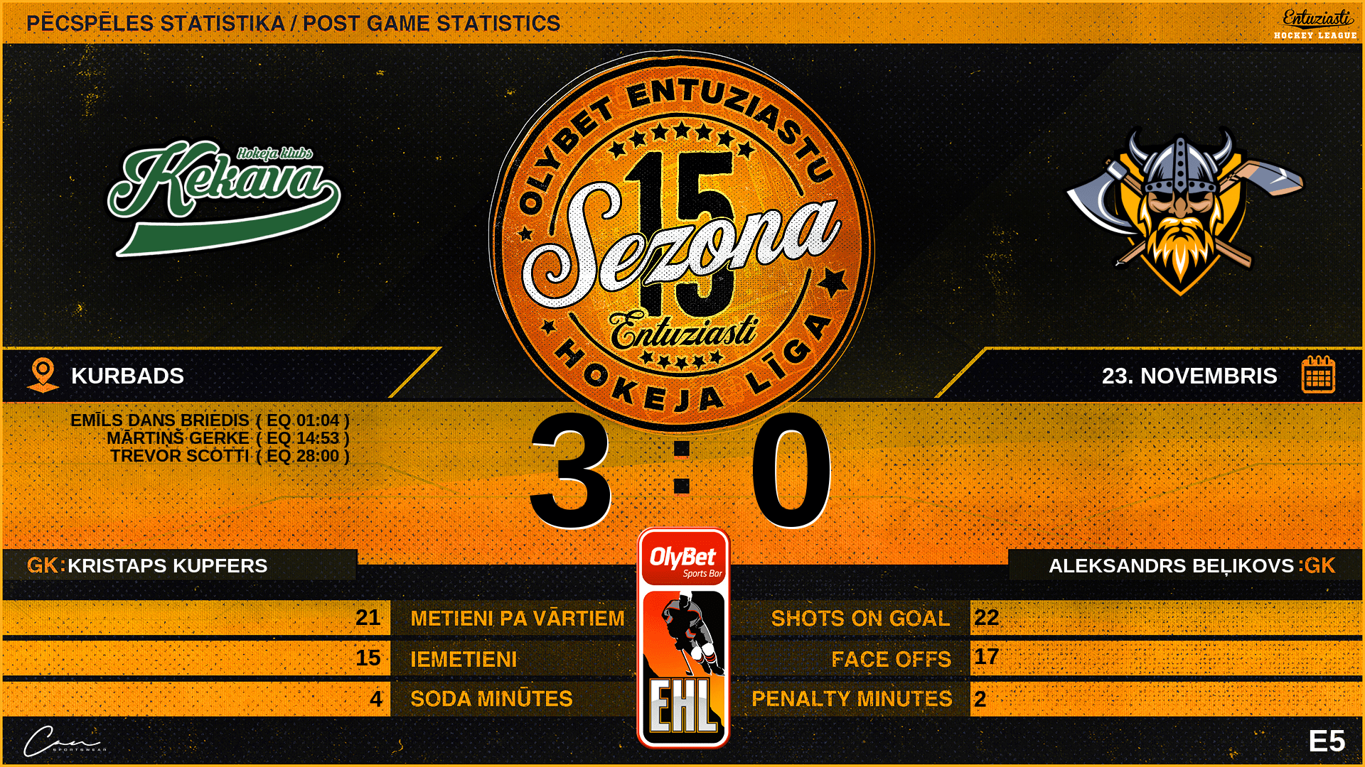 | 01:04 | ĶK1 | Vārti (EQ) | #45 Emīls Dans Briedis, piespēles: #18 Mārtiņš Gerke |