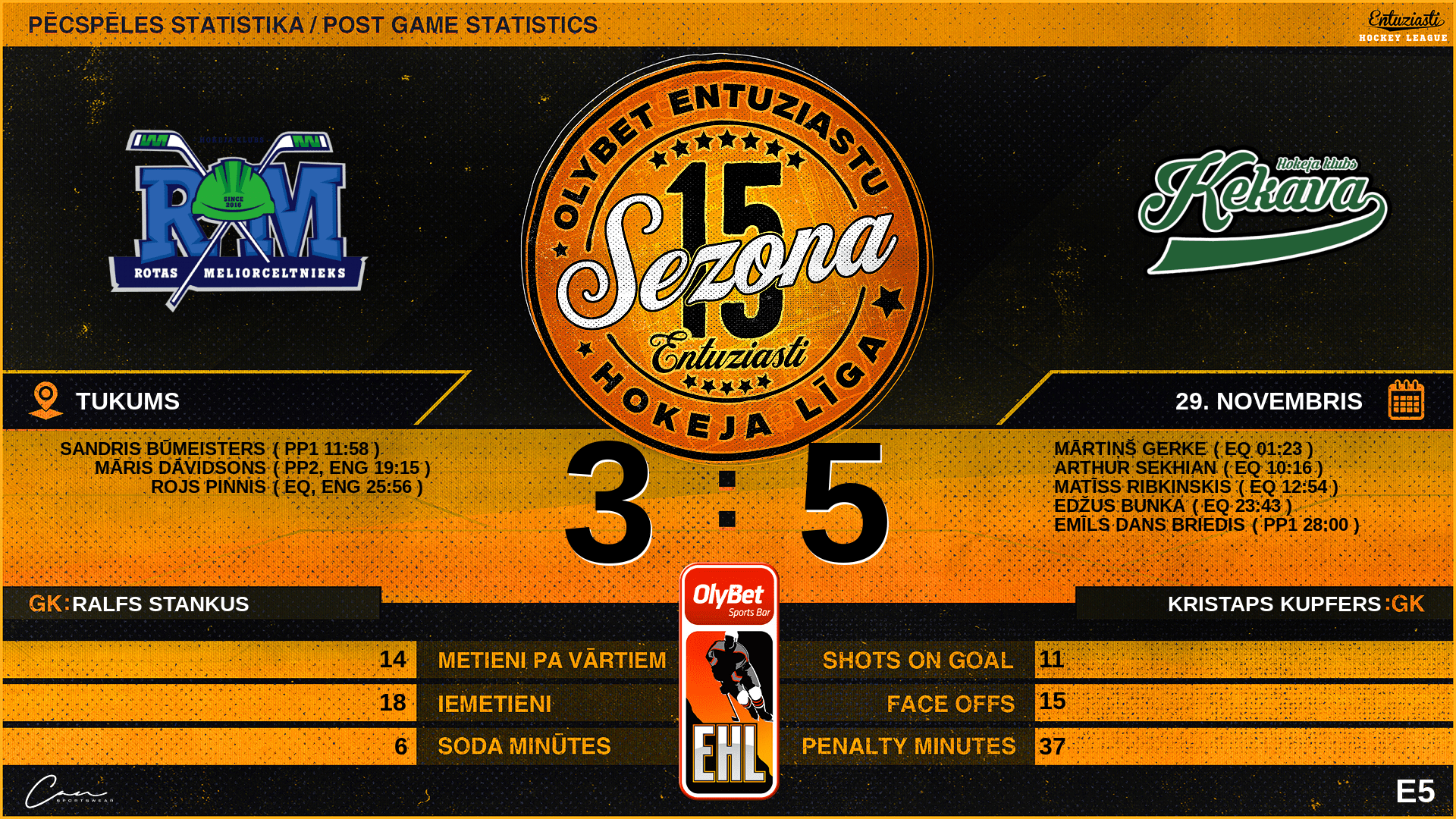 | 23:43 | ĶK1 | Vārti (EQ) | #14 Edžus Bunka, piespēles: #20 Edgars Jenerts |