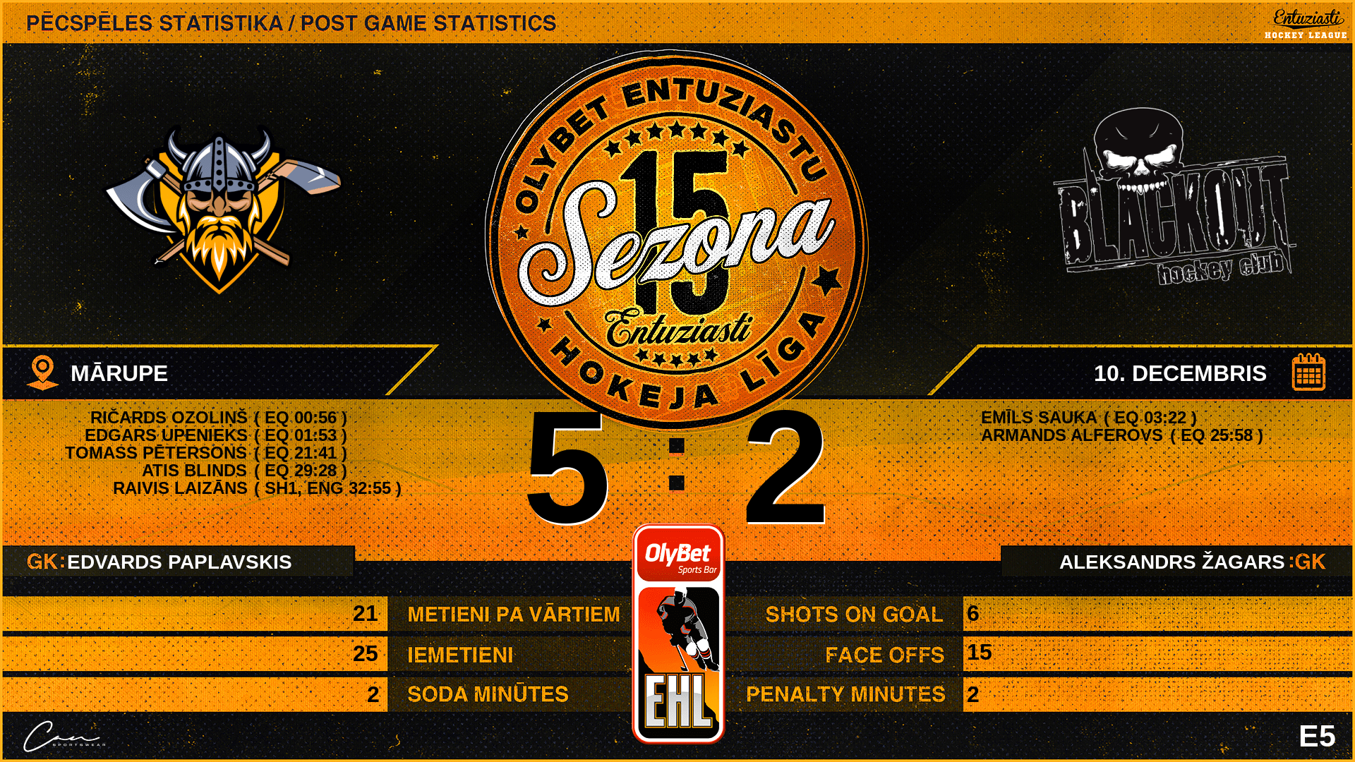 | 32:55 | VKG | Vārti (SH1, ENG) | #4 Raivis Laizāns, piespēles: #13 Edgars Upenieks, #72 Atis Blinds |