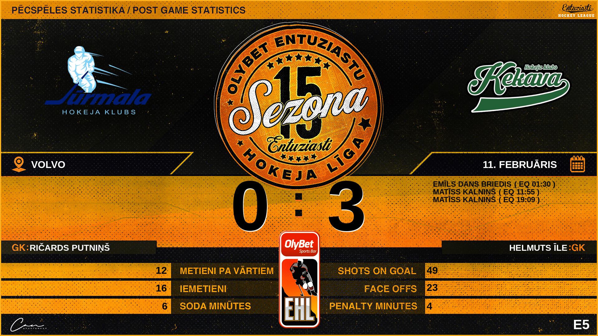 | 11:55 | ĶK1 | Vārti (EQ) JUR 0 : 2 ĶK1 | #8 Matīss Kalniņš, piespēles: #28 Matīss Gulbis, #71 Emīls Gulbis |