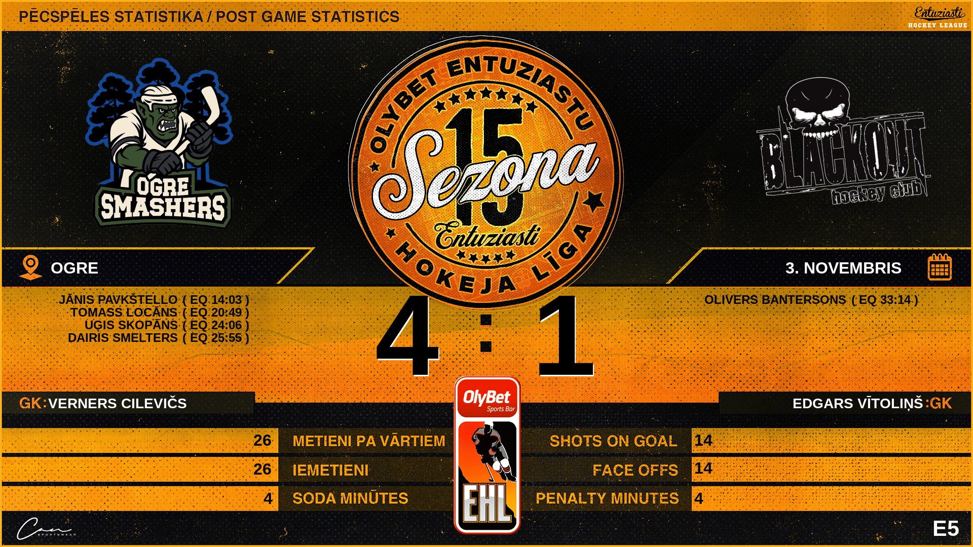 | 25:55 | SMH | Vārti (EQ) | #10 Dairis Smelters, piespēles: #98 Kristaps Ozoliņš |