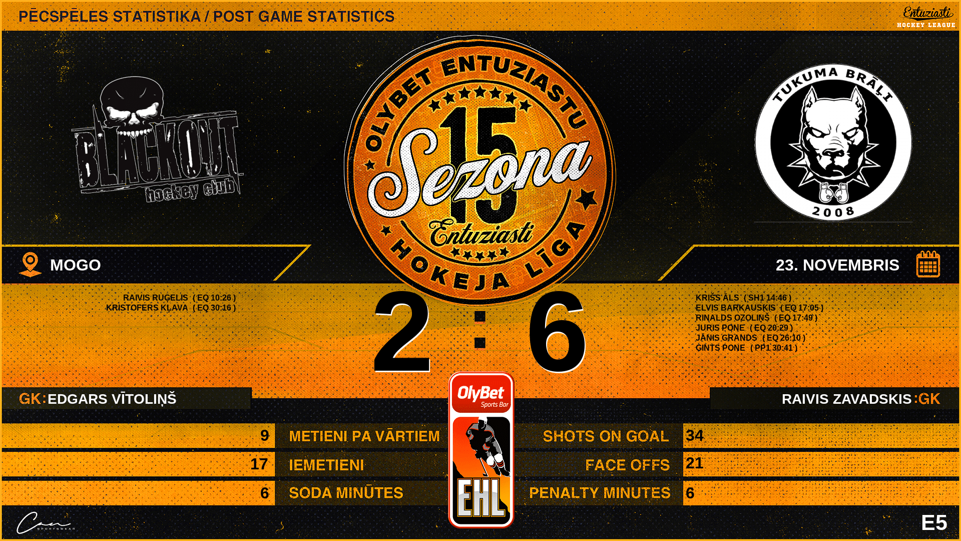 | 26:10 | TB3 | Vārti (EQ) | #24 Jānis Grands, piespēles: #3 Elvis Barkauskis, #71 Artūrs Safranovičs |