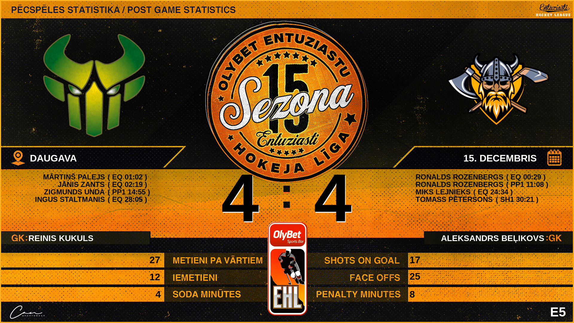 | 30:21 | VKG | Vārti (SH1) | #39 Tomass Pētersons, piespēles: #82 Ričards Ozoliņš, #23 Edgars Samedovs |