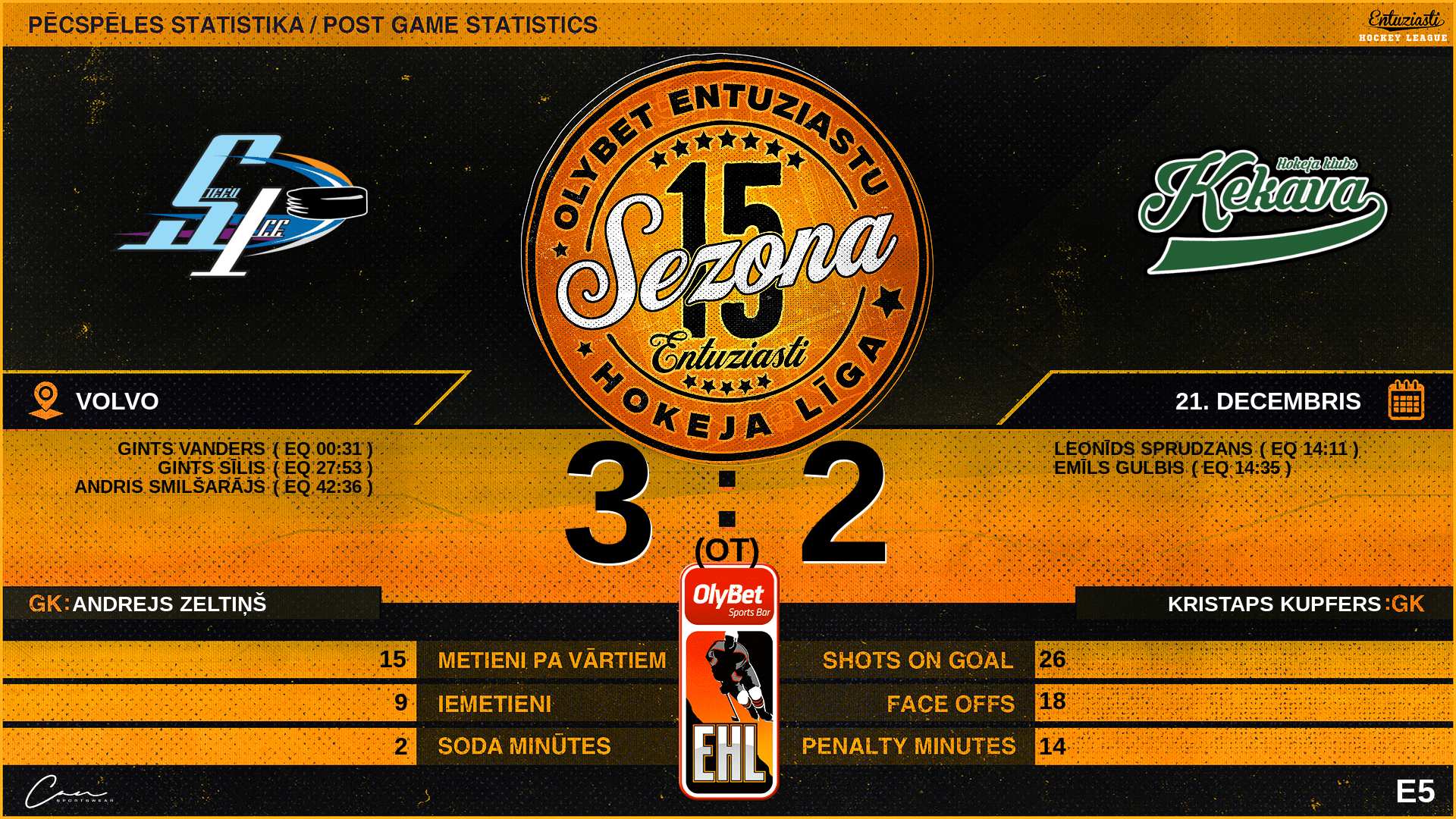 | 27:53 | STV | Vārti (EQ) | #41 Gints Sīlis, piespēles: #93 Gints Vanders, #1 Andrejs Zeltiņš |