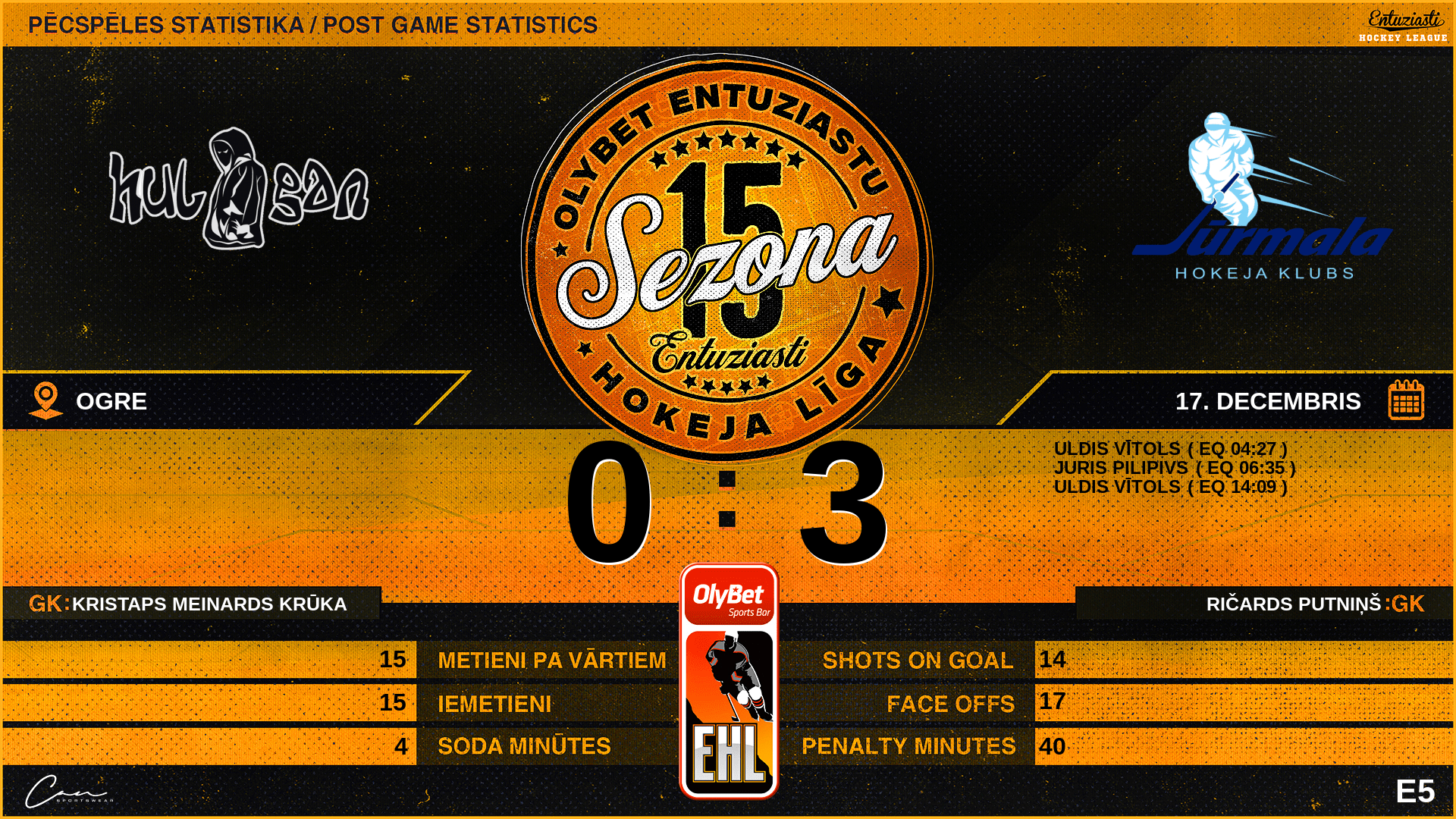 | 14:09 | JUR | Vārti (EQ) | #88 Oskars Lipskis, piespēles: #3 Uldis Vītols, #10 Renārs Laugals |