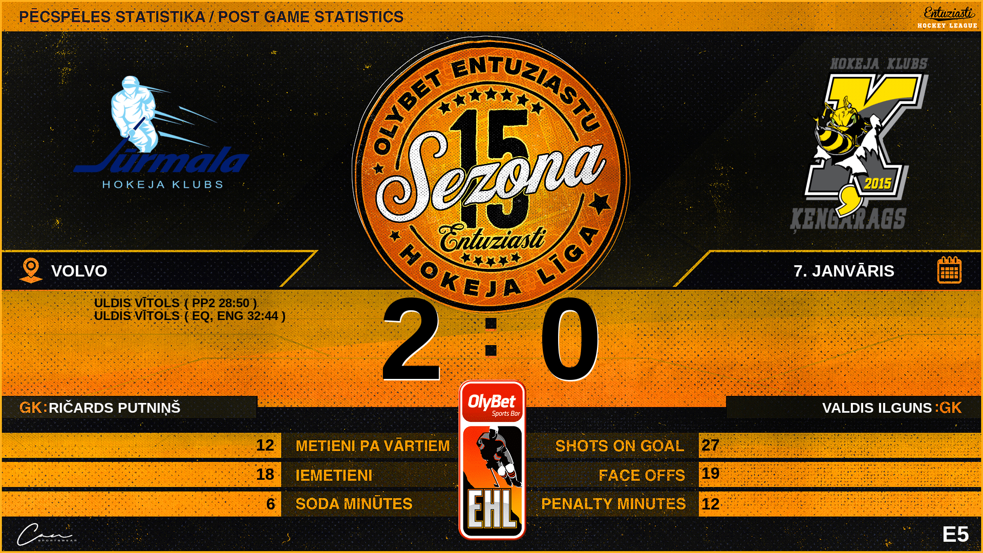 | 28:50 | JUR | Vārti (PP2) | #3 Uldis Vītols |