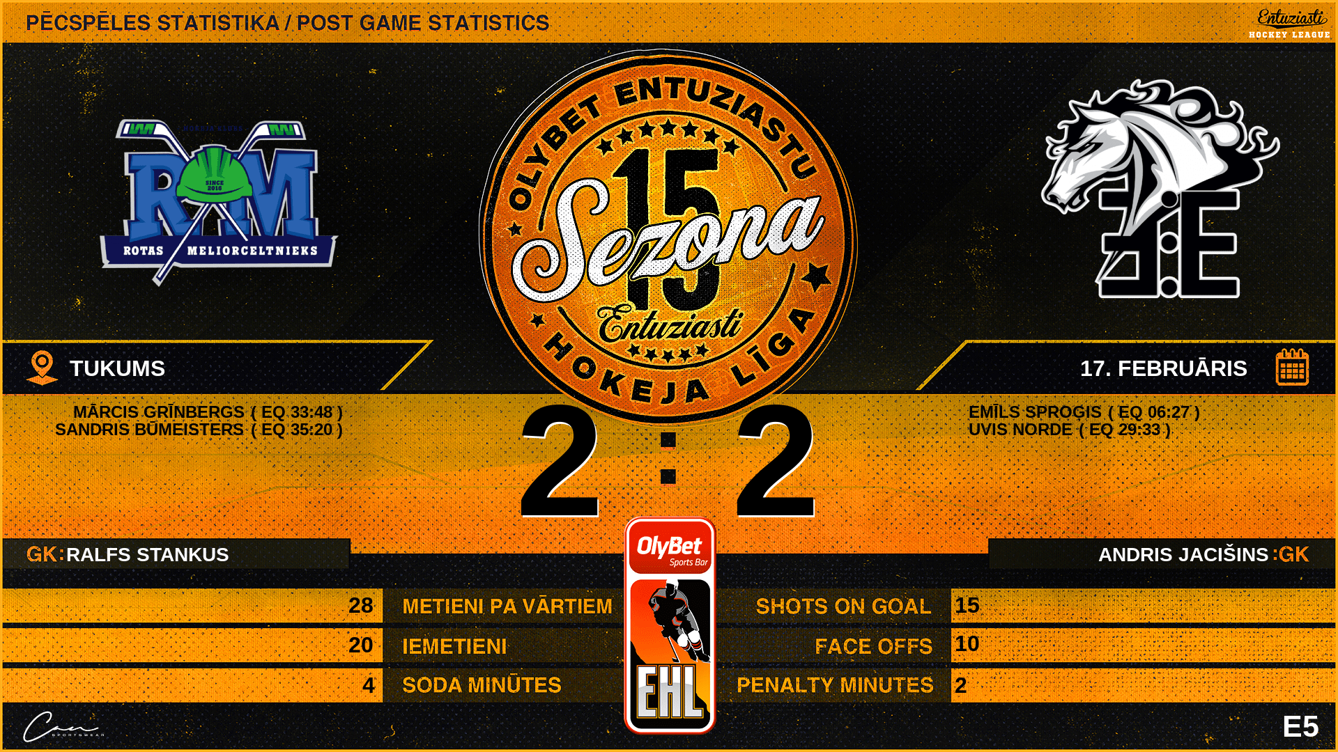 | 35:20 | RTS | Vārti (EQ) RTS 2 : 2 USN | #92 Sandris Būmeisters, piespēles: #75 Mārcis Grīnbergs, #38 Markuss Daniels Druka |