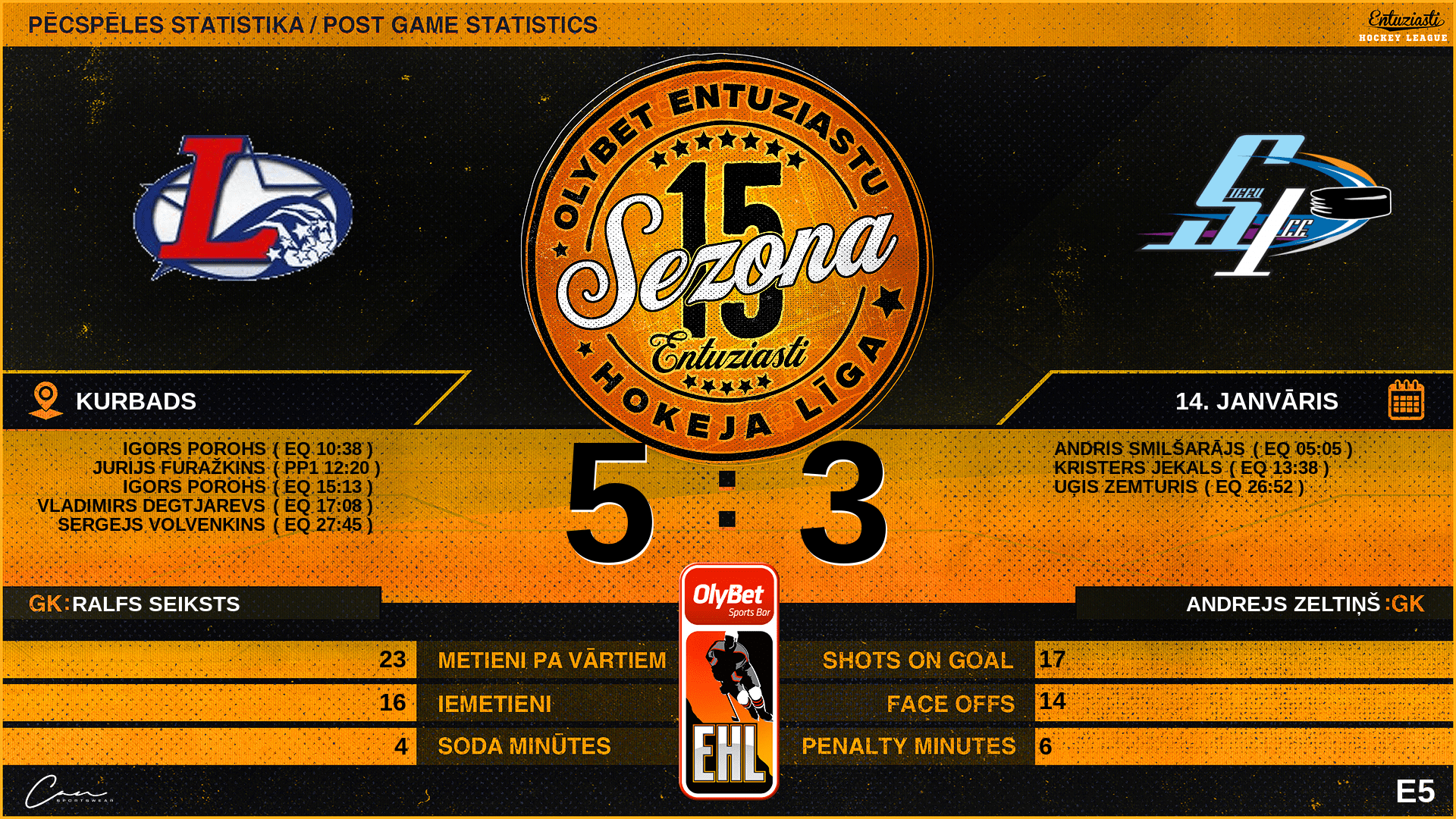 | 05:05 | STV | Vārti (EQ) | #8 Andris Smilšarājs, piespēles: #20 Jurijs Gončarovs |