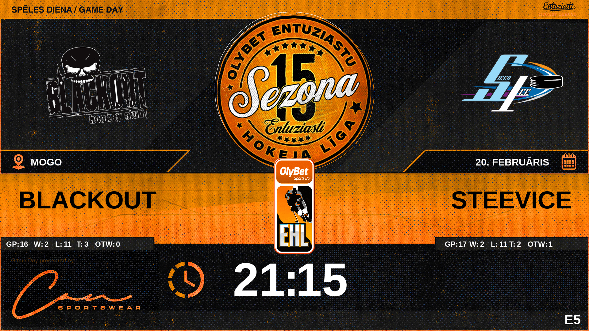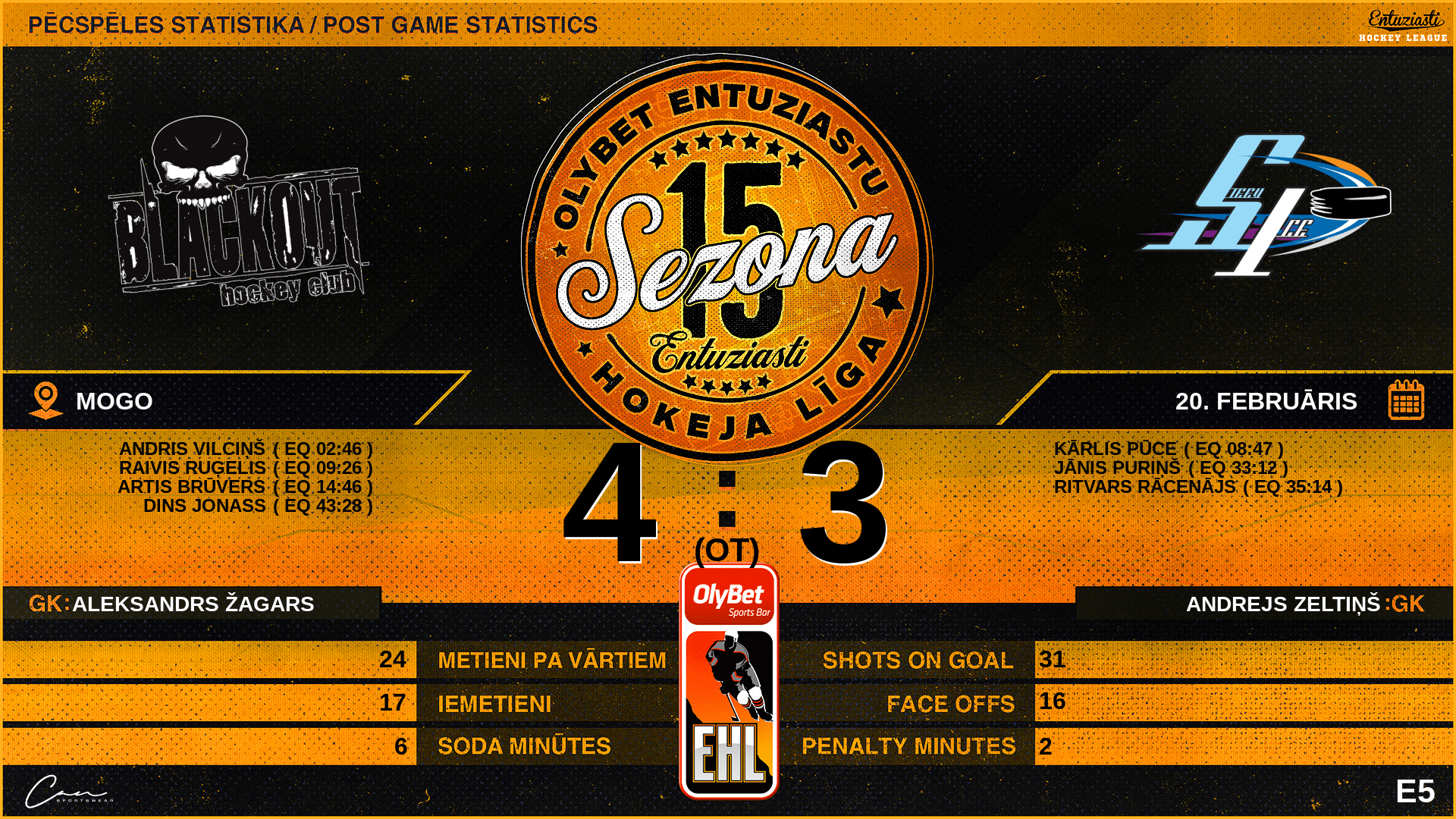 | 08:47 | STV | Vārti (EQ) BLC 1 : 1 STV | #19 Kārlis Pūce, piespēles: #25 Kristers Jekals, #86 Jānis Puriņš |