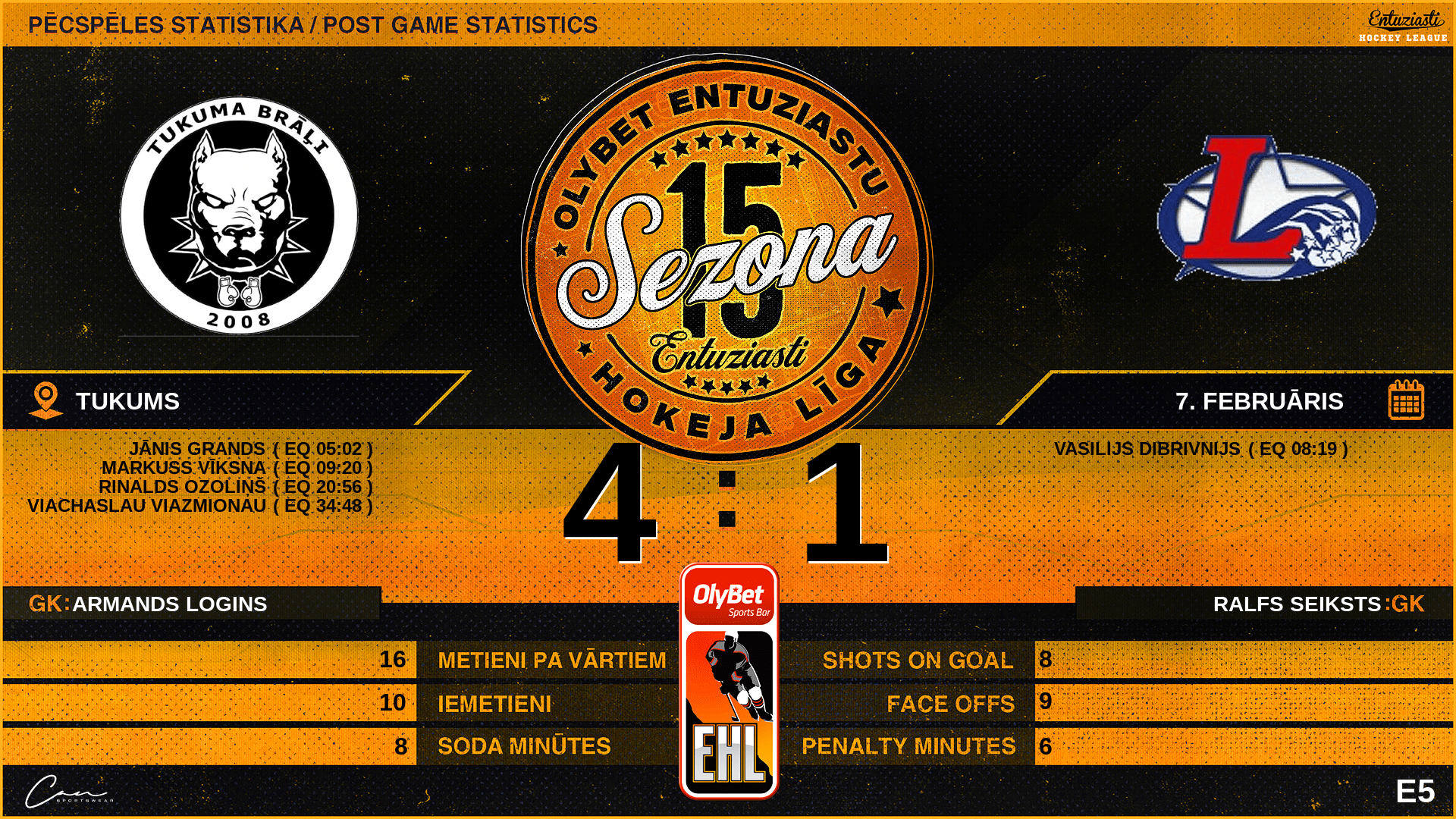 | 05:02 | TB3 | Vārti (EQ) | #24 Jānis Grands, piespēles: #77 Artūrs Safranovičs |