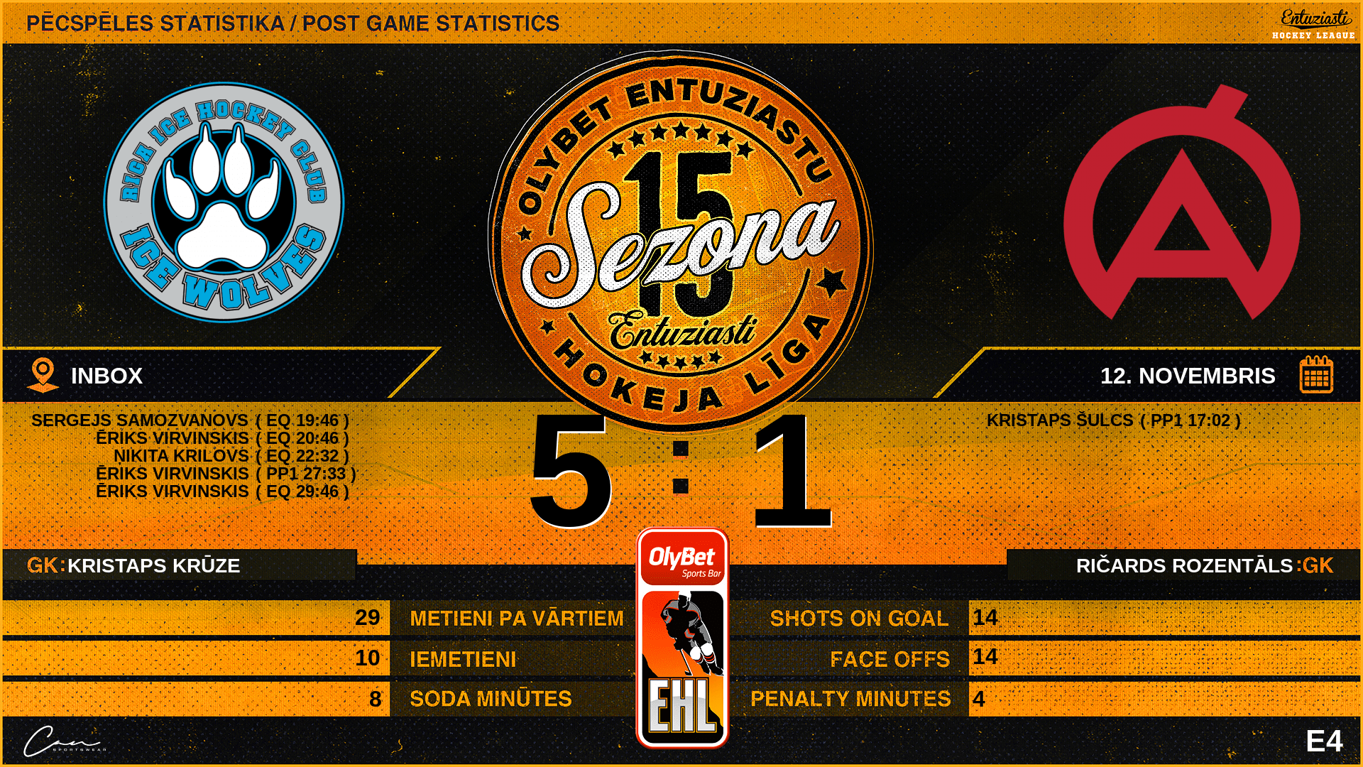 | 29:46 | WF2 | Vārti (EQ) | #28 Ēriks Virvinskis, piespēles: #18 Arturs Krasnoščokovs |