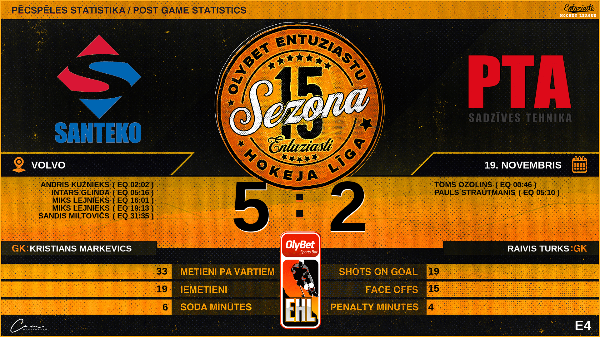 | 05:10 | PTA | Vārti (EQ) | #12 Pauls Strautmanis, piespēles: #3 Krists Šakars, #29 Patriks Flaksis |