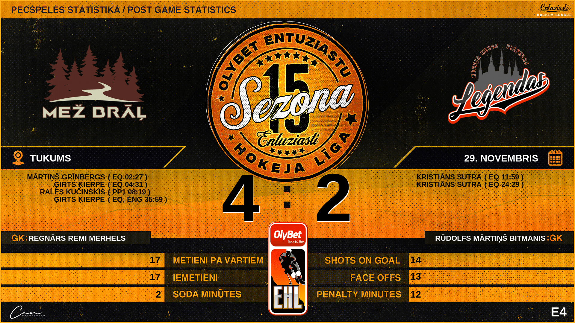 | 02:27 | MZB | Vārti (EQ) | #14 Mārtiņš Grīnbergs, piespēles: #7 Klāvs Krūskops |