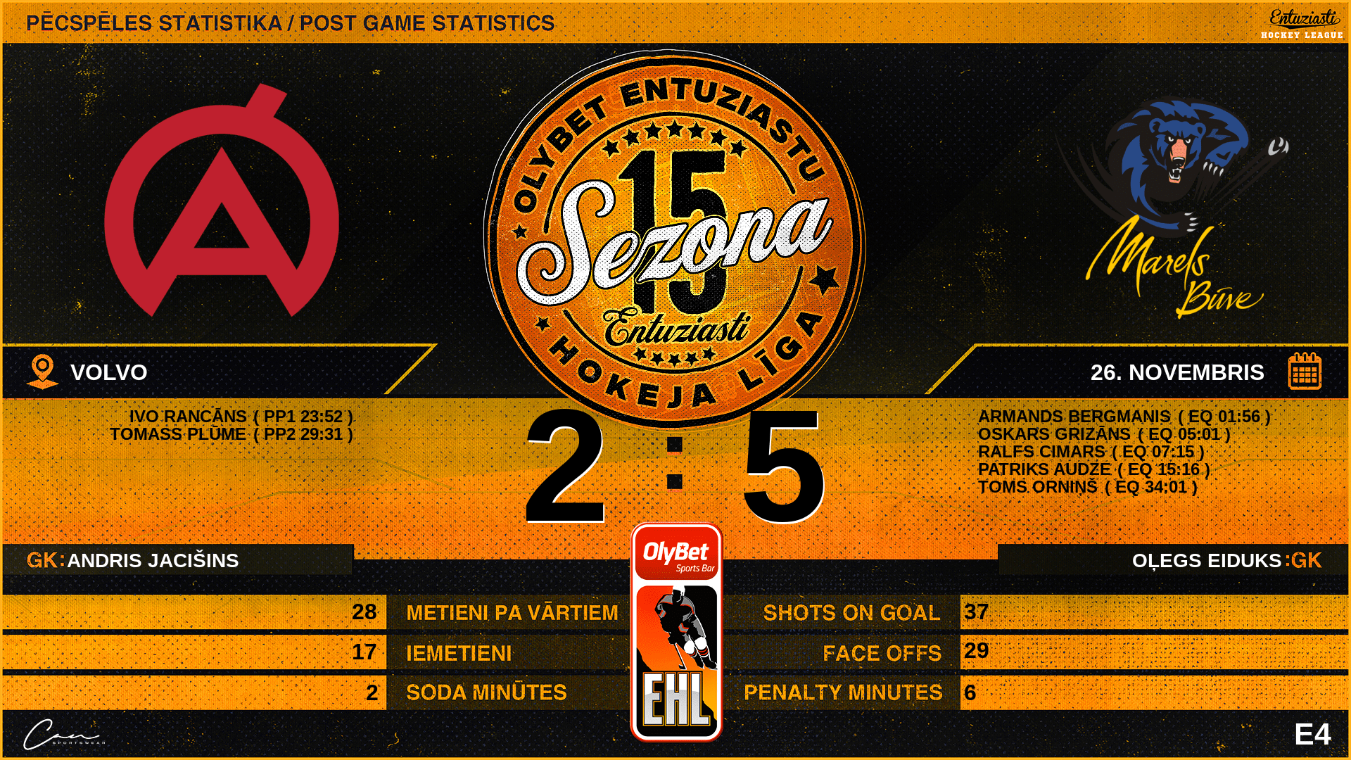 | 05:01 | MB2 | Vārti (EQ) | #24 Oskars Grizāns, piespēles: #12 Aleksandrs Galkins |