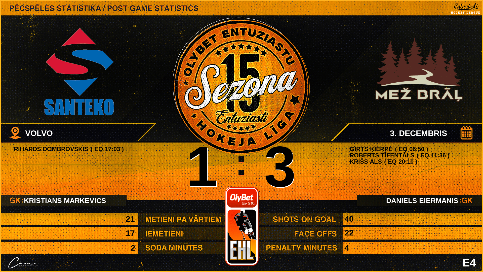 | 06:50 | MZB | Vārti (EQ) | #77 Ģirts Ķierpe, piespēles: #28 Kaspars Rudzītis |